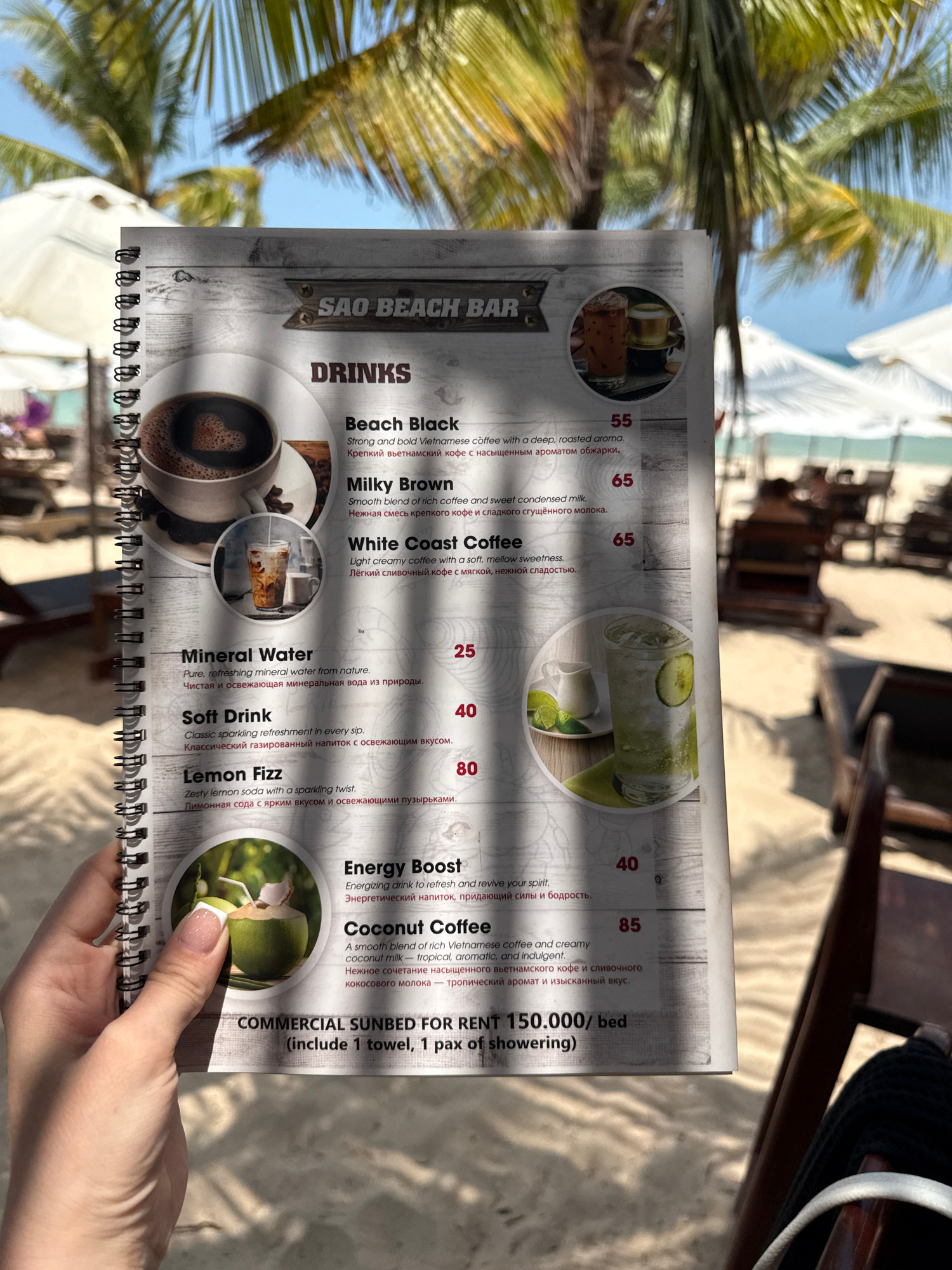 The image features a close-up of a person's hand holding a spiral-bound menu from "SAO BEACH BAR," set against a vibrant, sunny tropical backdrop. The hand, positioned on the lower right, has well-gro…read more