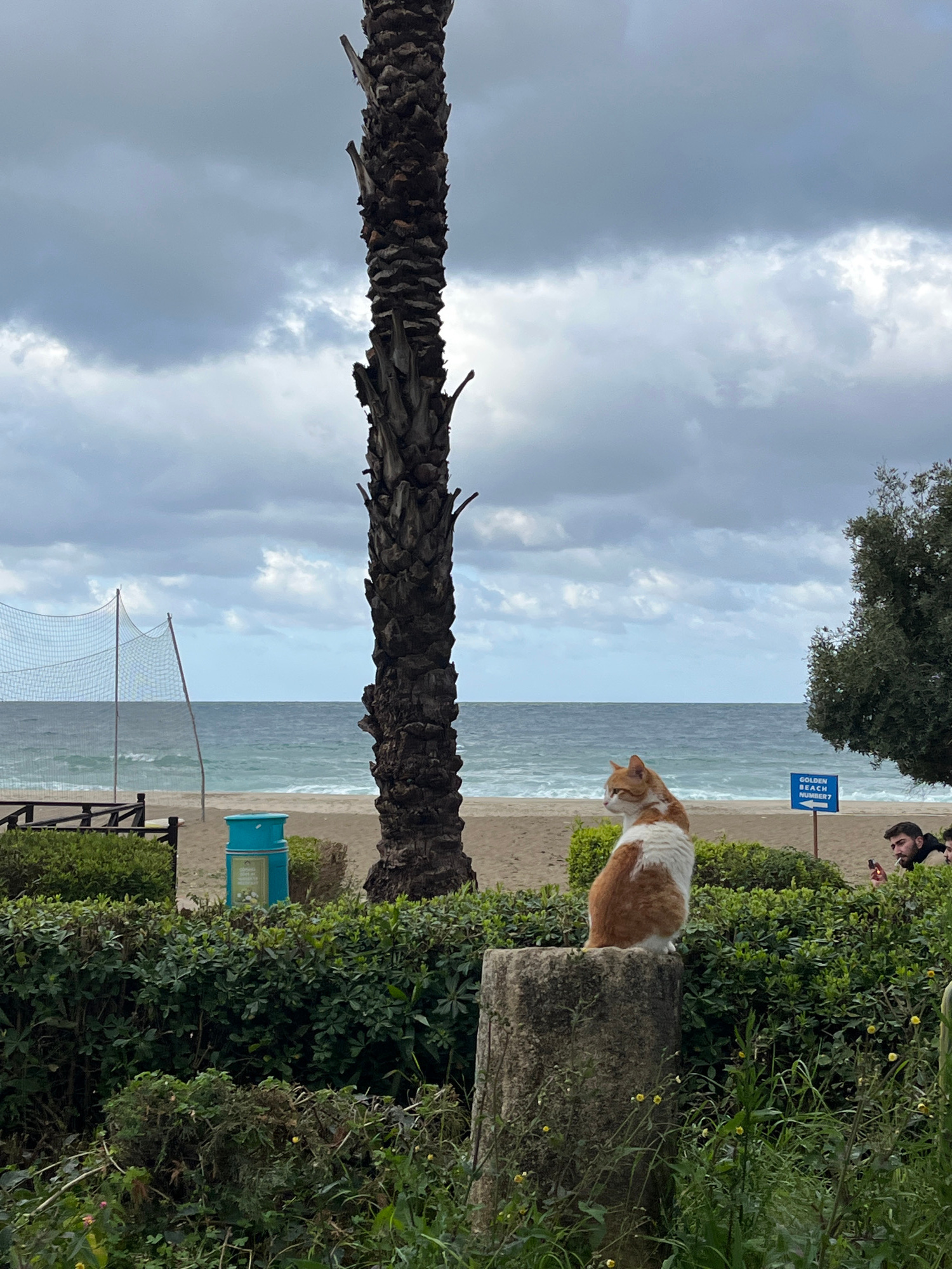 A coastal scene in Alanya, Turkey, includes a beach with a volleyball net, partially obscured by a palm tree trunk. A cat sits on a concrete structure surrounded by greenery overlooking the beach. A s…read more