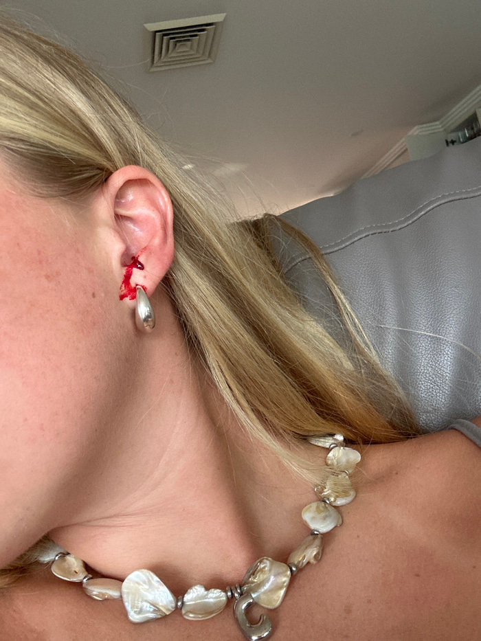 A close-up shot focuses on a woman's ear with a large, teardrop-shaped earring. The earlobe appears torn and is bleeding. Her blonde hair partially covers her face and shoulders. A necklace with irreg…read more