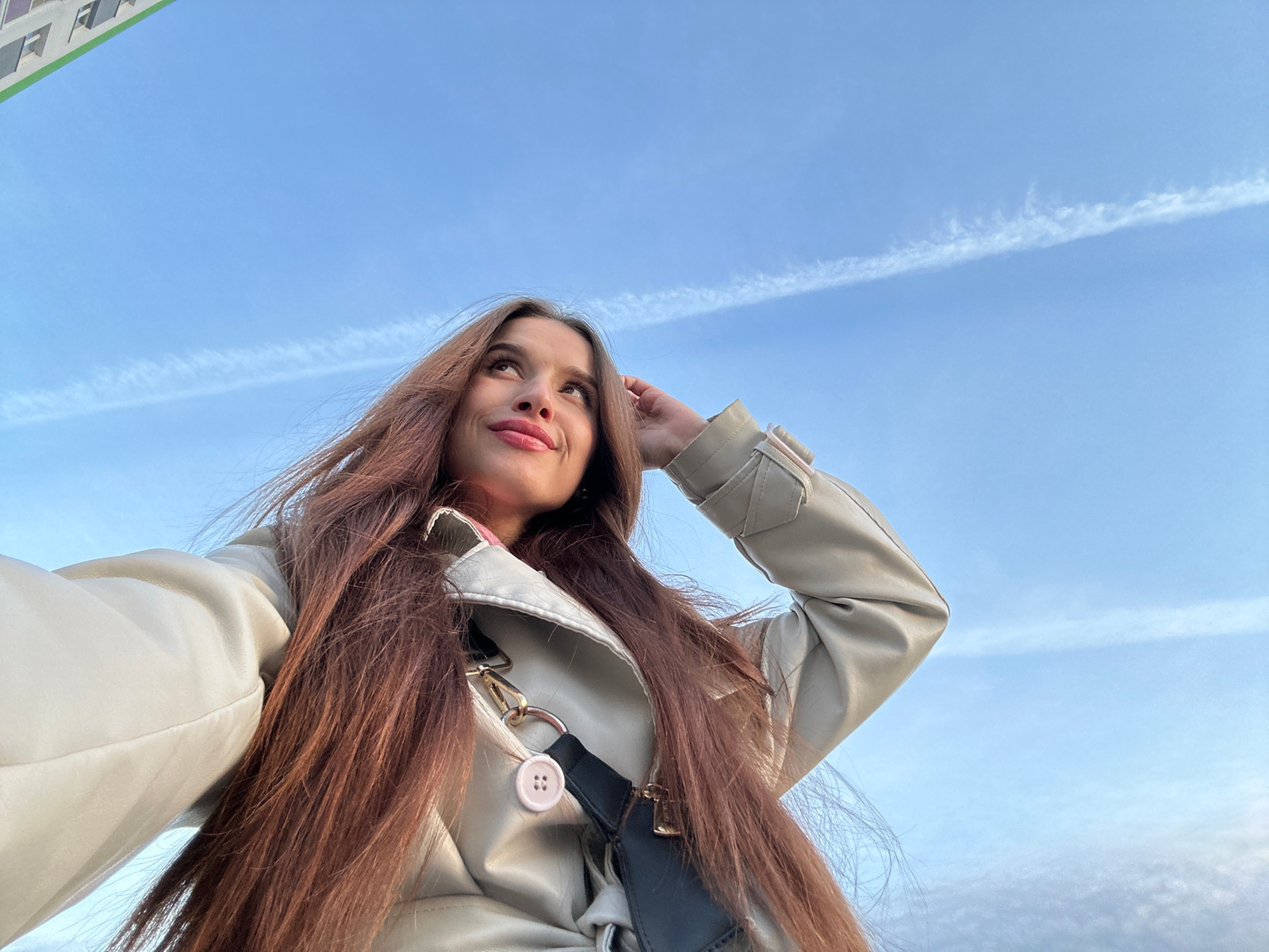 An inverted, low-angle medium shot depicts a woman standing outdoors, apparently looking down at the camera. The woman has long, reddish-brown hair that obscures part of her face. She wears a light beige coat with a button closure, and a black purse strap crosses her chest. Behind the woman, a blue sky with contrails is visible, along with the top corner of an apartment building. The location is likely Yekaterinburg, Russia. | Open Wire