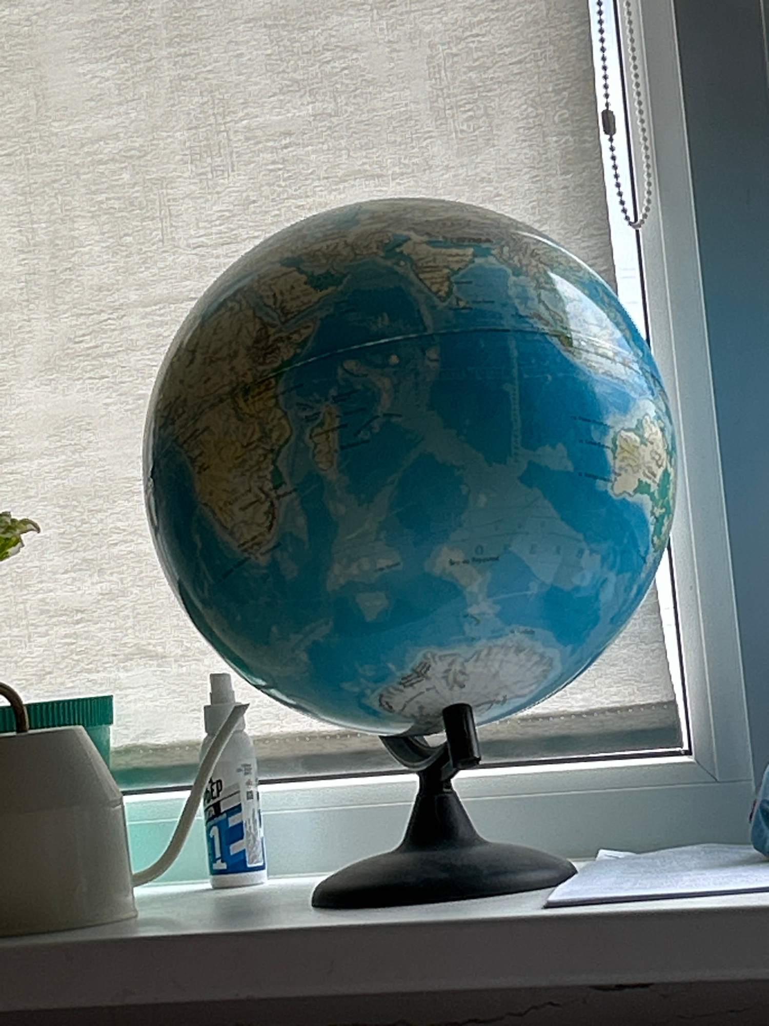 A static shot captures a physical globe positioned in front of a window, likely in Chaikovsky, Russia. The globe features light blue oceans and tan/green landmasses, with North America, Greenland, par…read more
