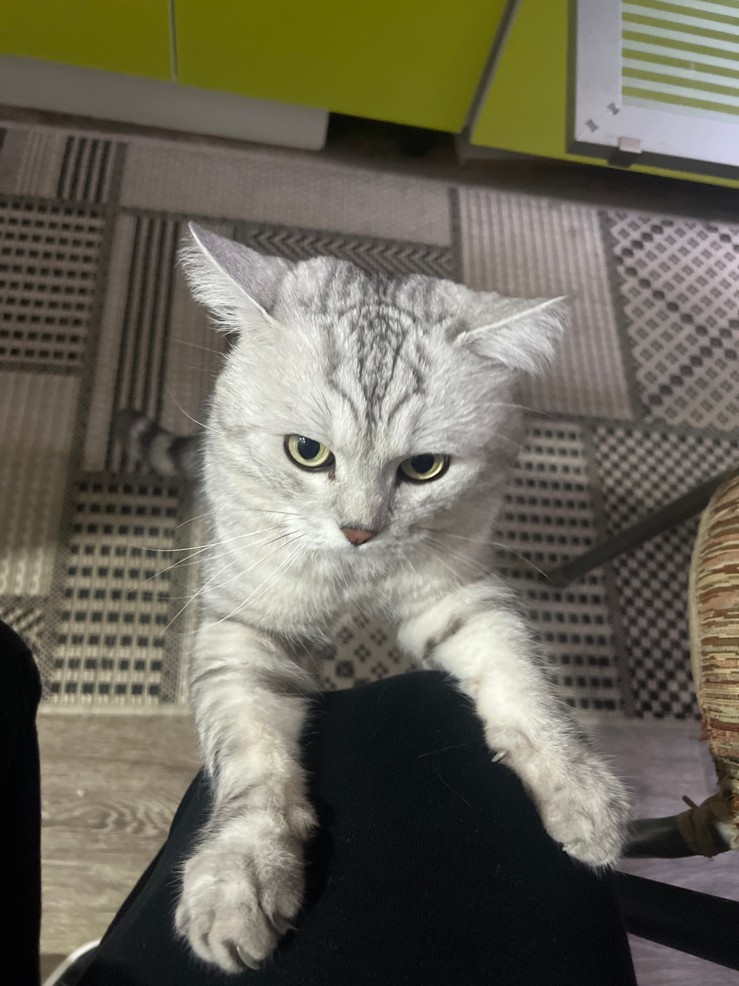 A gray tabby cat clings to a person's leg, which is clad in black clothing. The cat's paws are visible, gripping the fabric. The background includes a patterned rug, a green and white cabinet, and a c…read more