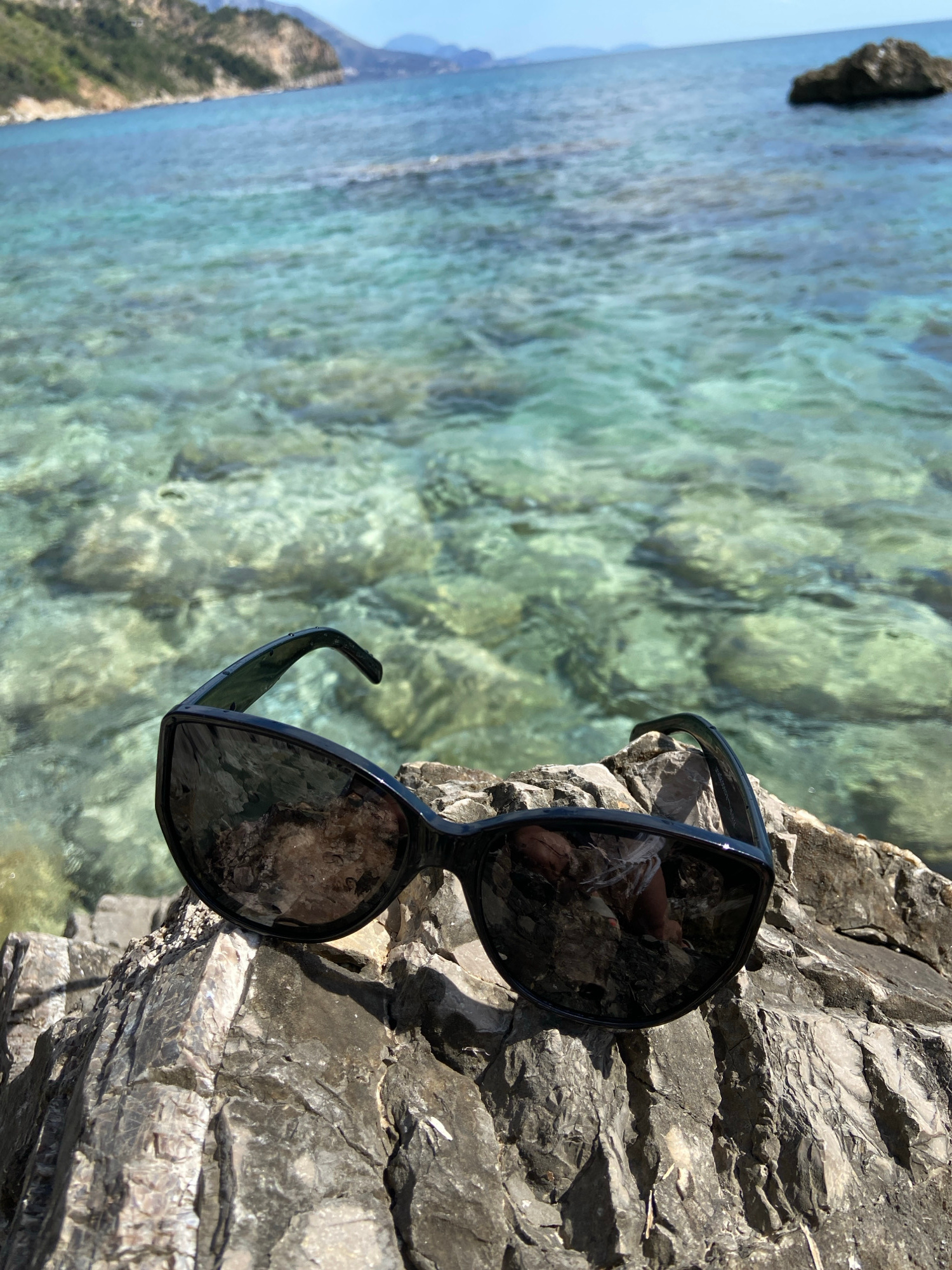 A pair of sunglasses rest on a gray, jagged rock face. The lenses reflect a blurred image of the rock. In the background, turquoise water stretches toward the horizon where a hazy coastline and distan…read more