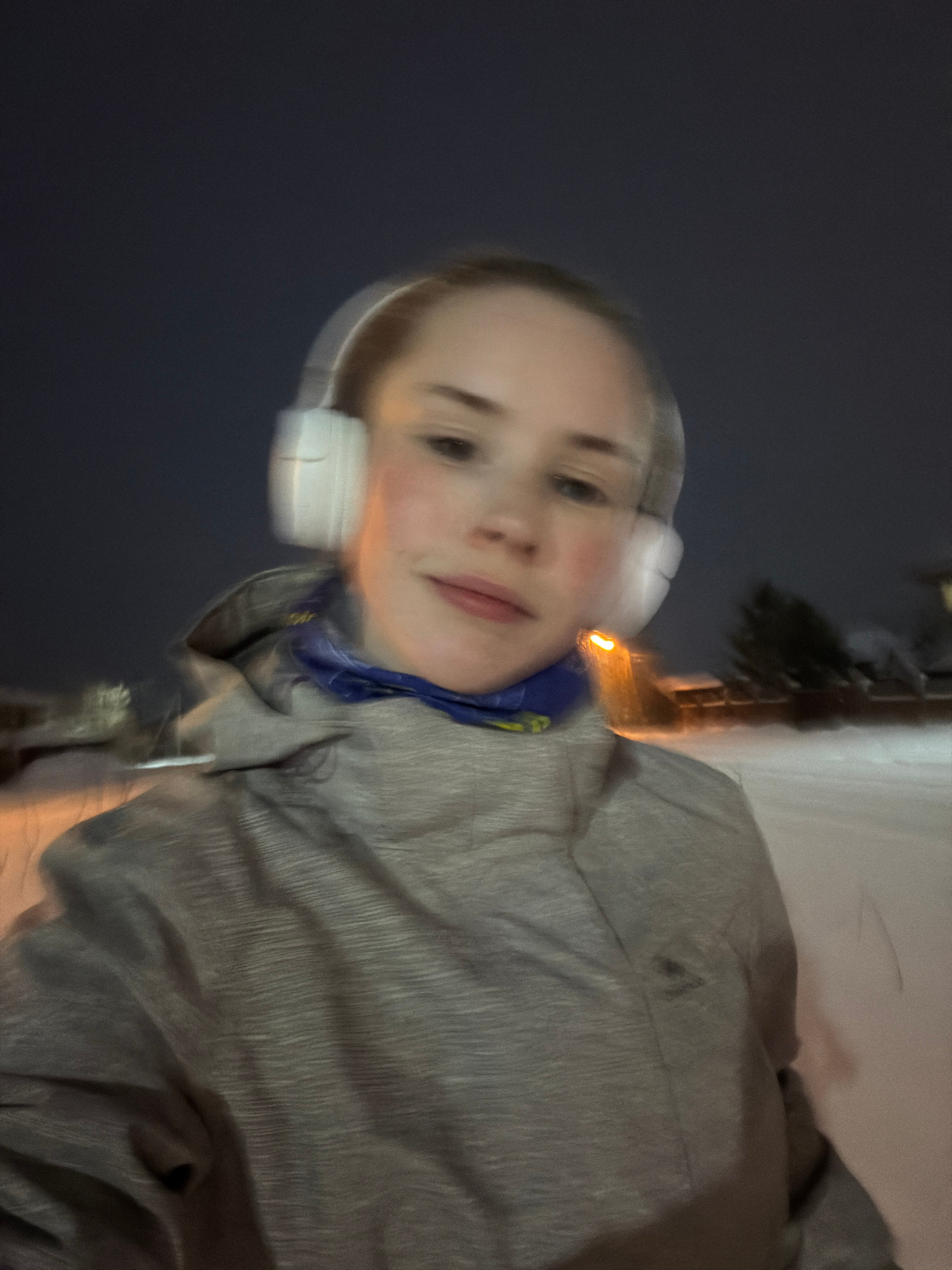 A blurred, selfie-style photograph shows a fair-skinned person with headphones, wearing a grey hooded jacket and blue neck gaiter. The background is dark, transitioning to a snow-covered ground with a…read more
