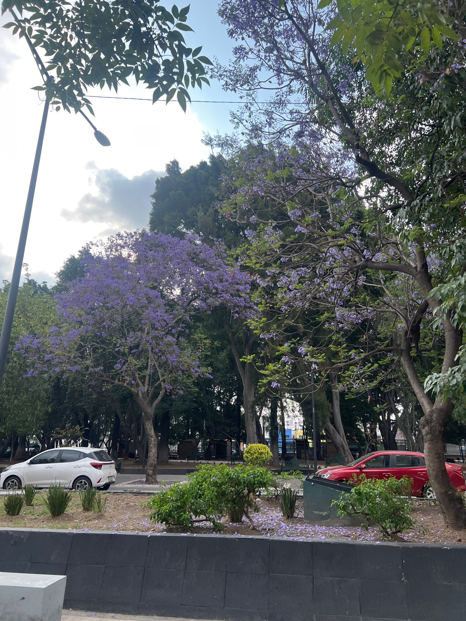 This image depicts a street scene in Puebla, Mexico, characterized by blooming jacaranda trees with their distinctive purple flowers. A white car is parked on the right side of the street, and a red c…read more