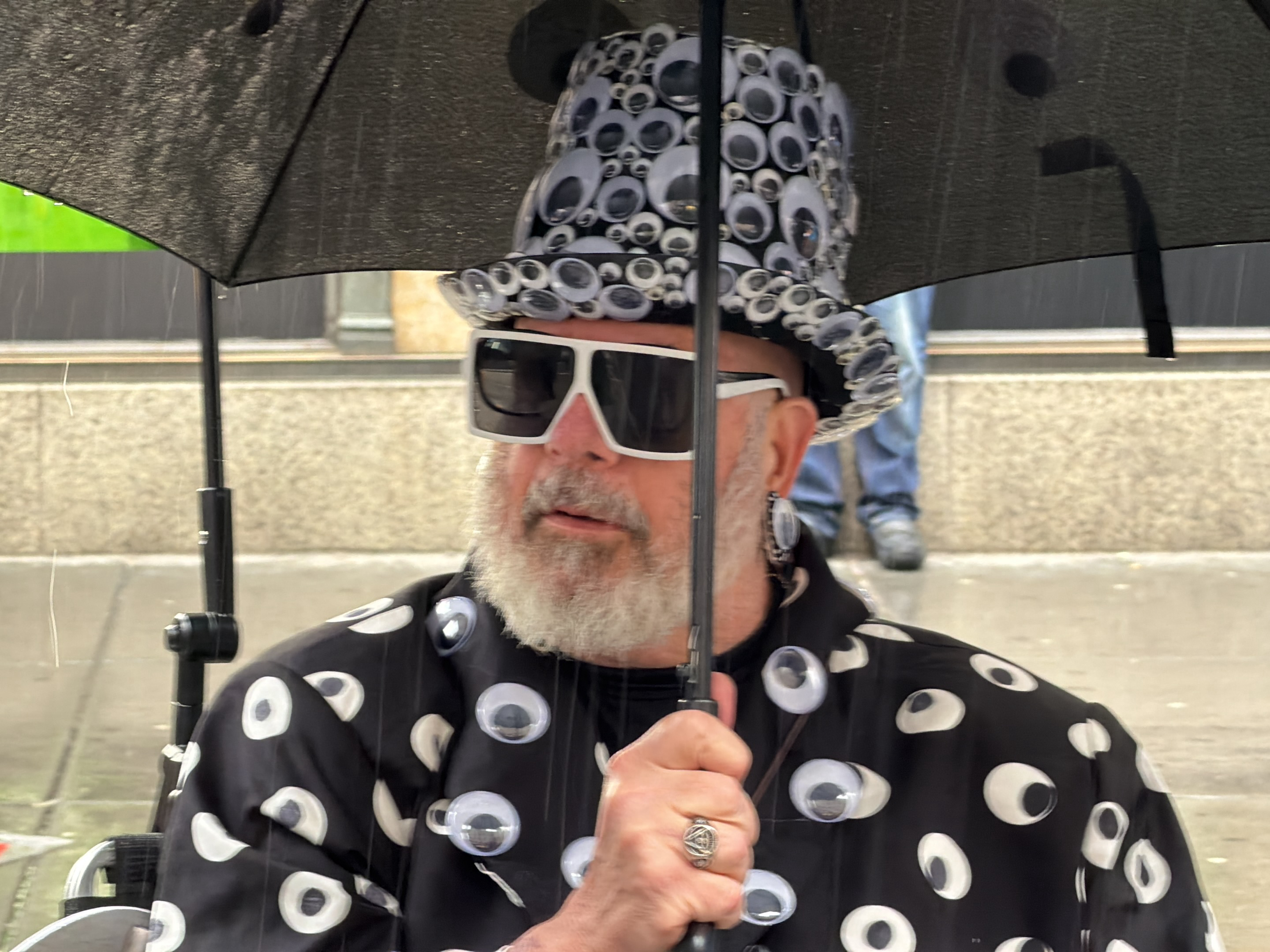 A person stands under an umbrella in what appears to be New York City. The individual is wearing a hat and jacket adorned with googly eyes, along with large white-rimmed sunglasses. The umbrella is op…read more