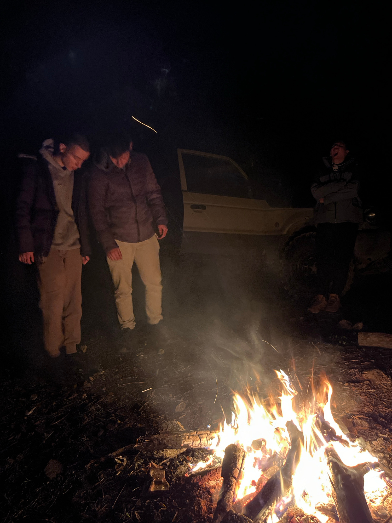 Two people are lying on the ground beside a campfire. A vehicle door is open nearby, and another person stands near the vehicle. The location is obscured, but inferred to be Karavelovo, Bulgaria.