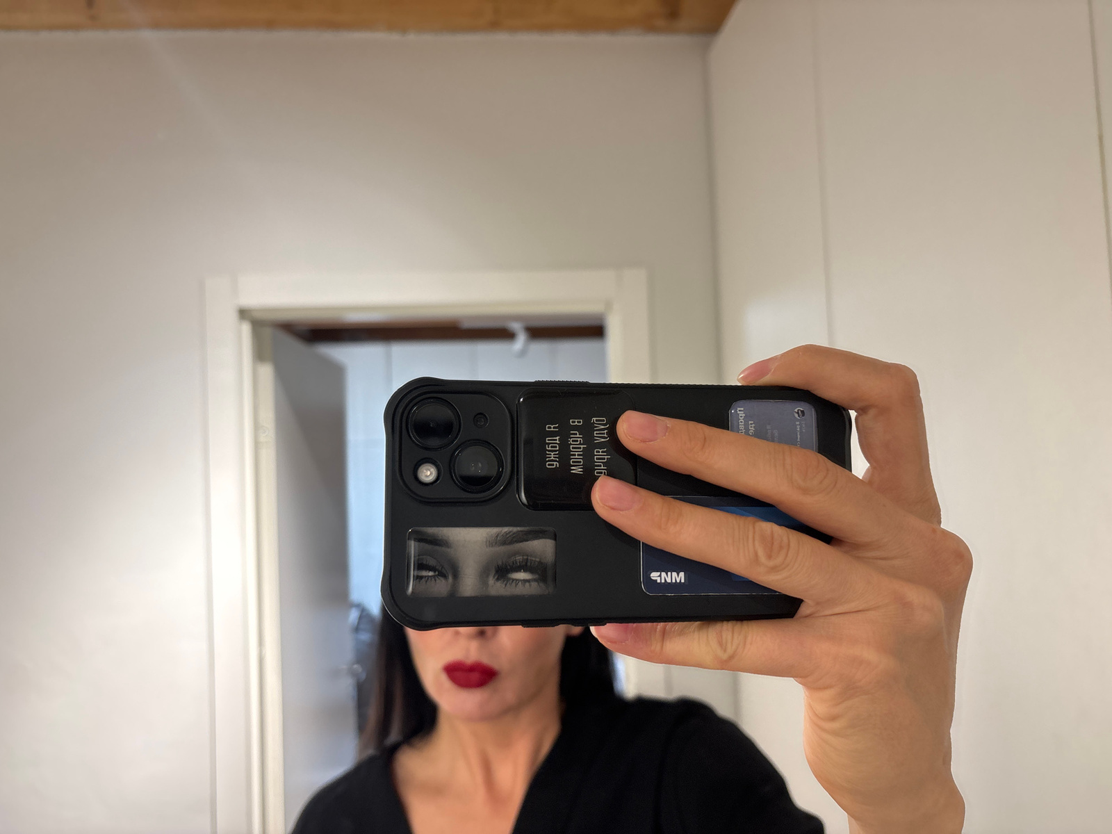 The image shows a woman taking a selfie in a bathroom or similarly furnished room. The phone, an iPhone in a black protective case, obscures the majority of the woman's face, but red lipstick is visib…read more