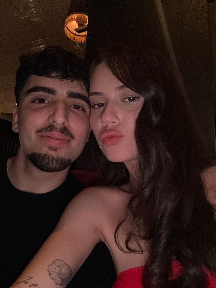 A brunette woman in a red top poses closely with a man wearing a black shirt. She has her head tilted, looking at the camera with pursed lips. The man also faces the camera, displaying a short beard a…read more
