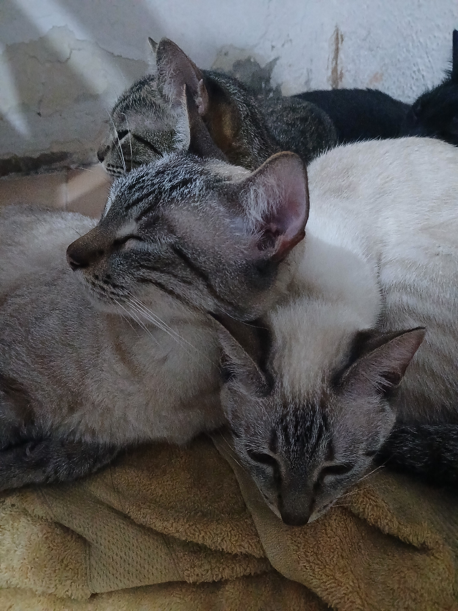 The image shows three cats sleeping in a close huddle, possibly on a towel or blanket. Two of the cats have similar grey and brown tabby-like patterns on their faces and light-colored bodies. A third…read more