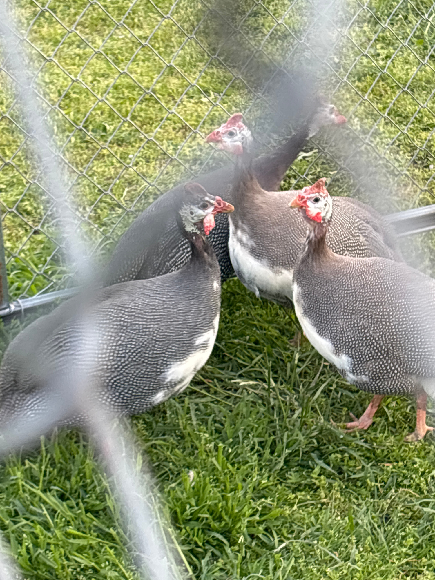 Four helmeted guineafowl stand on grass inside a wire enclosure. The setting is possibly in Lehchevo, Bulgaria. The birds are speckled gray with red and white heads. The grass is green and lush. A met…read more