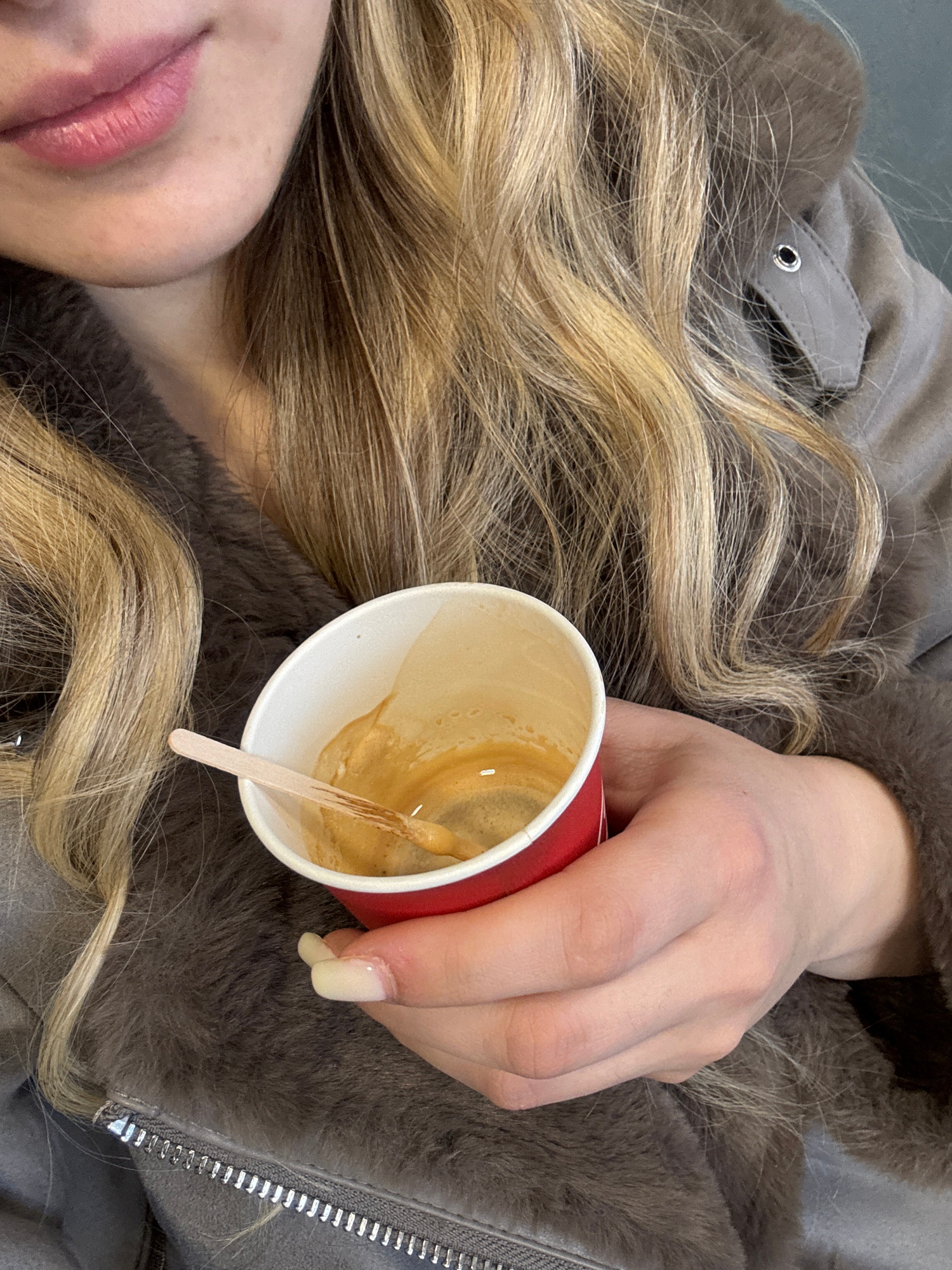 A photograph shows a person lying down, possibly indoors, holding a red coffee cup with a wooden stirrer inside. The cup contains the remnants of a coffee beverage. The person has blonde, wavy hair sp…read more