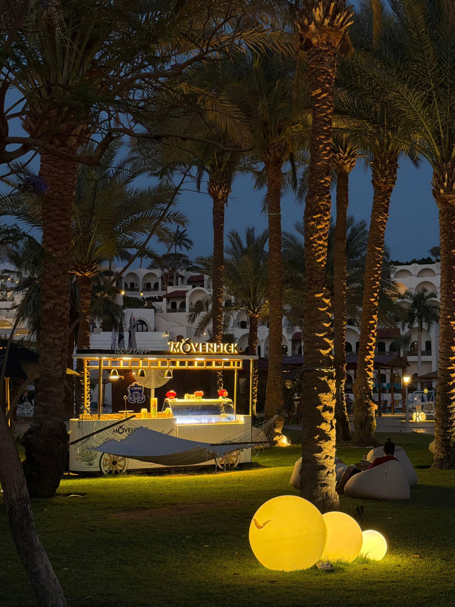 This evening scene in Sharm El Sheikh, Egypt, depicts a tranquil resort outdoor area at twilight or night. Tall palm trees, with their textured trunks and shadowy fronds, line the left side of the ima…read more