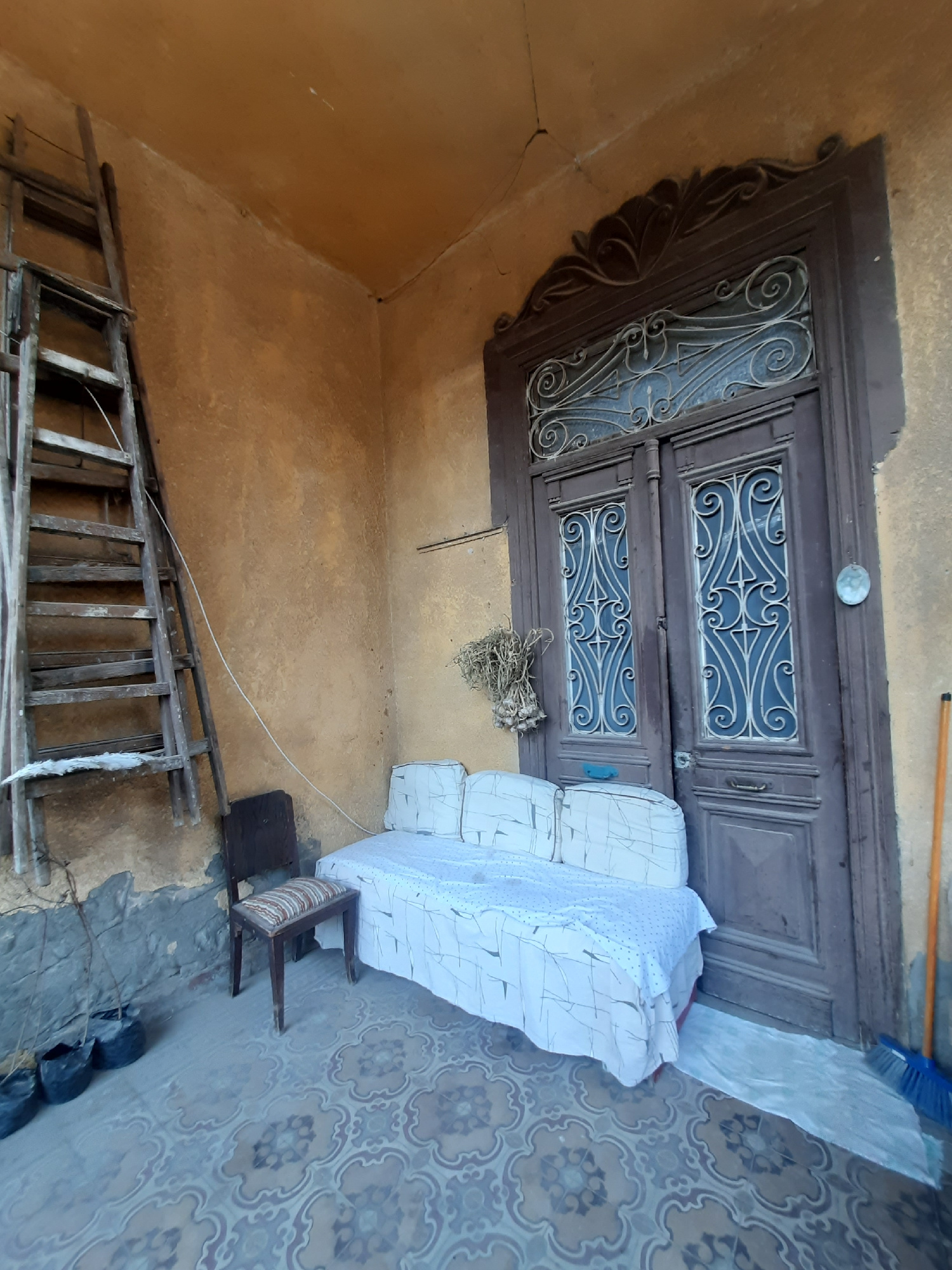 The image shows an indoor scene in what appears to be an old building in Cairo, Egypt. The scene is dominated by a large, ornate, dark wood double door with decorative metalwork. A bundle of dried gar…read more