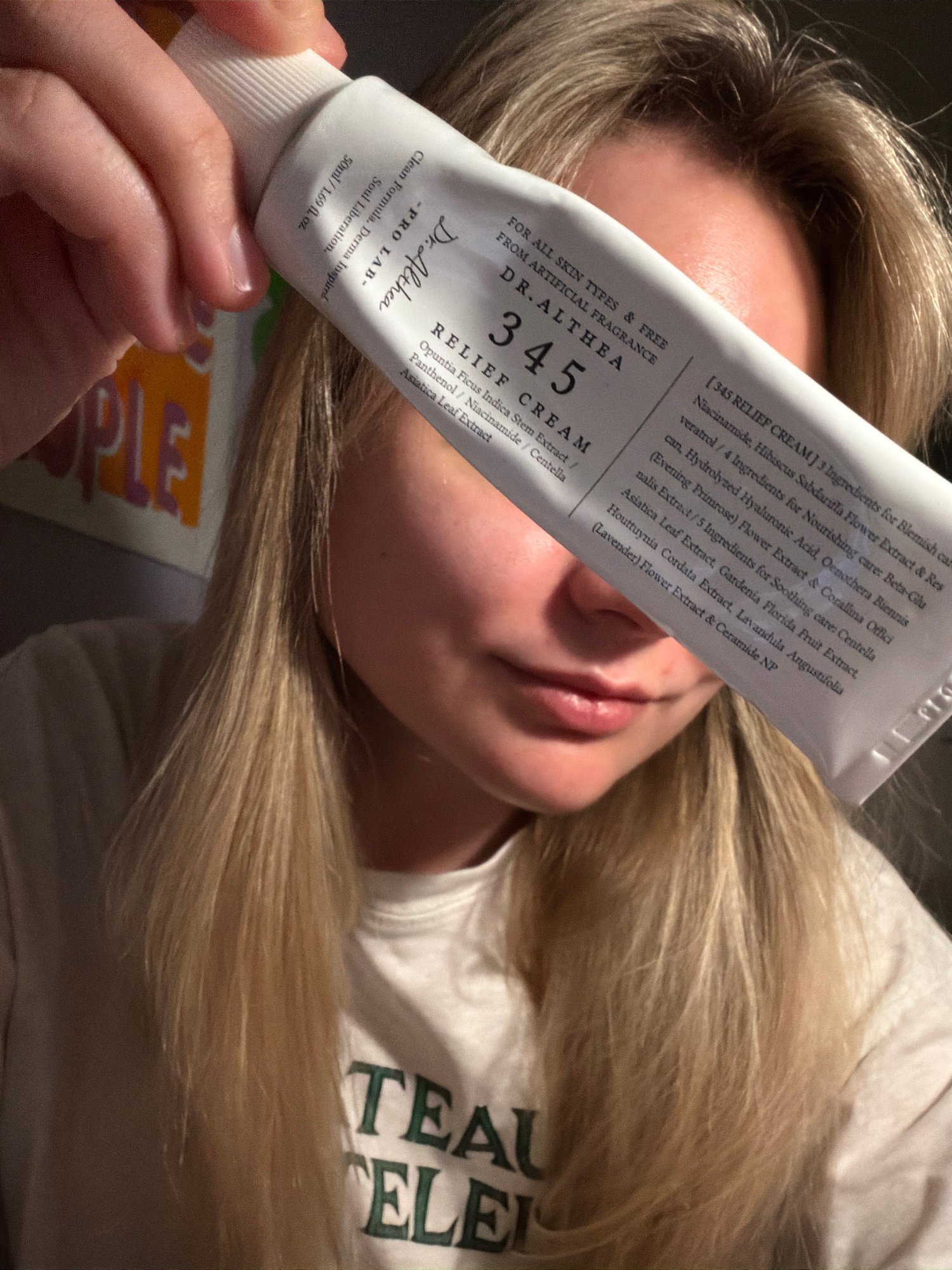 A person is holding a tube of "Dr. Althea 345 Relief Cream" close to their face. The tube is white with black text listing ingredients and information about the product. The person has light skin and…read more