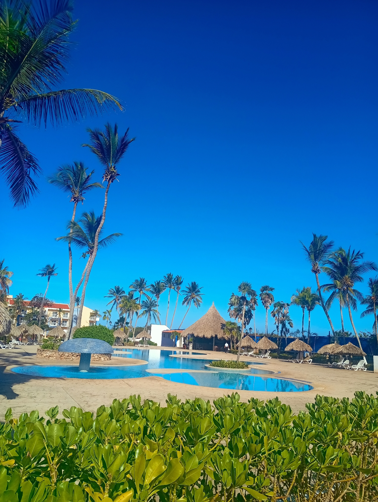 The image depicts an outdoor recreational area, likely a resort, in Playa El Agua, Venezuela, under a clear, cloudless blue sky. In the foreground, a dense hedge of vibrant green, broad-leafed plants…read more