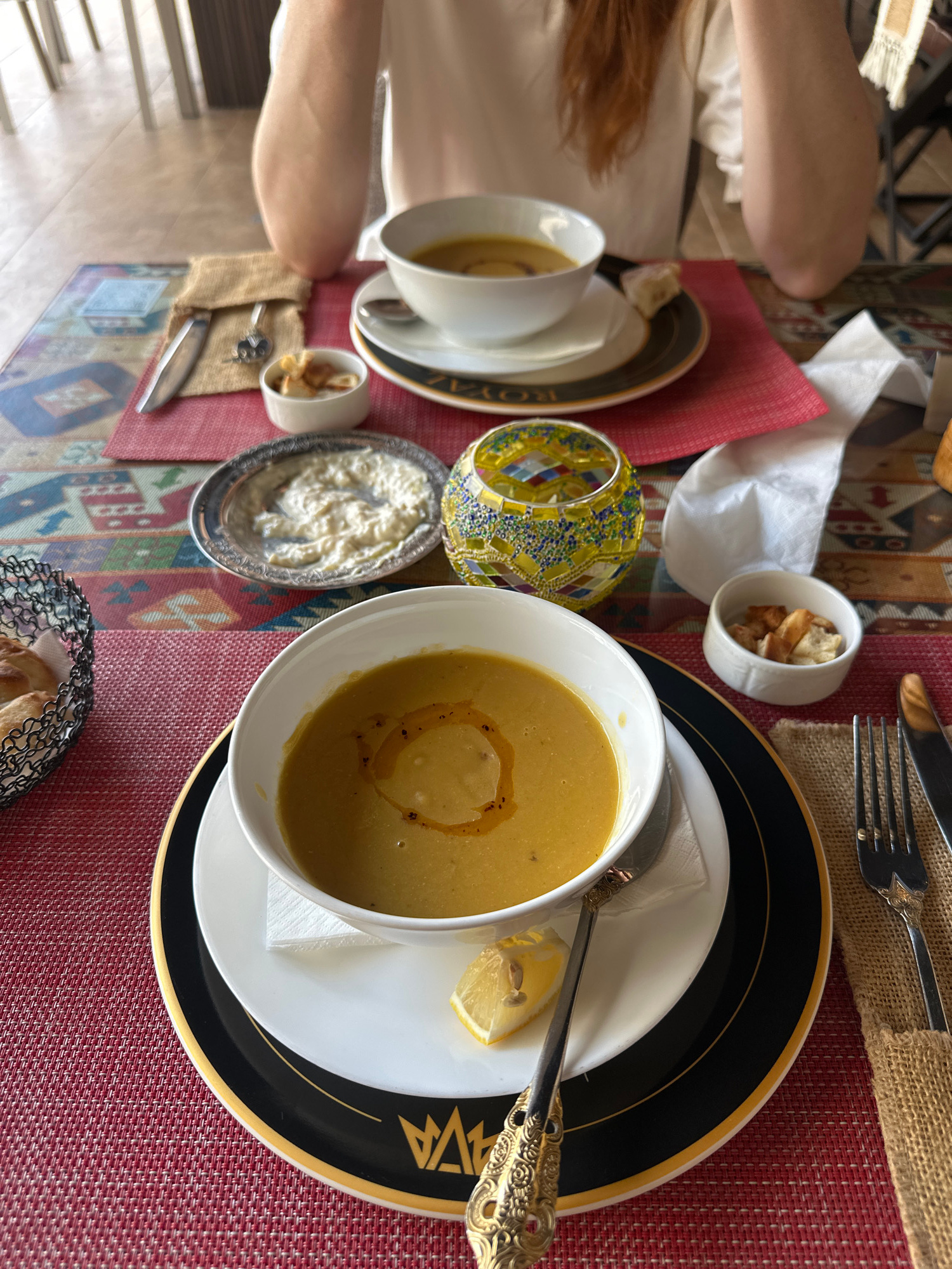 The image shows a table setting, possibly at a restaurant, with two place settings visible. A woman with long, light brown hair is partially visible on the left side of the frame. Each setting include…read more