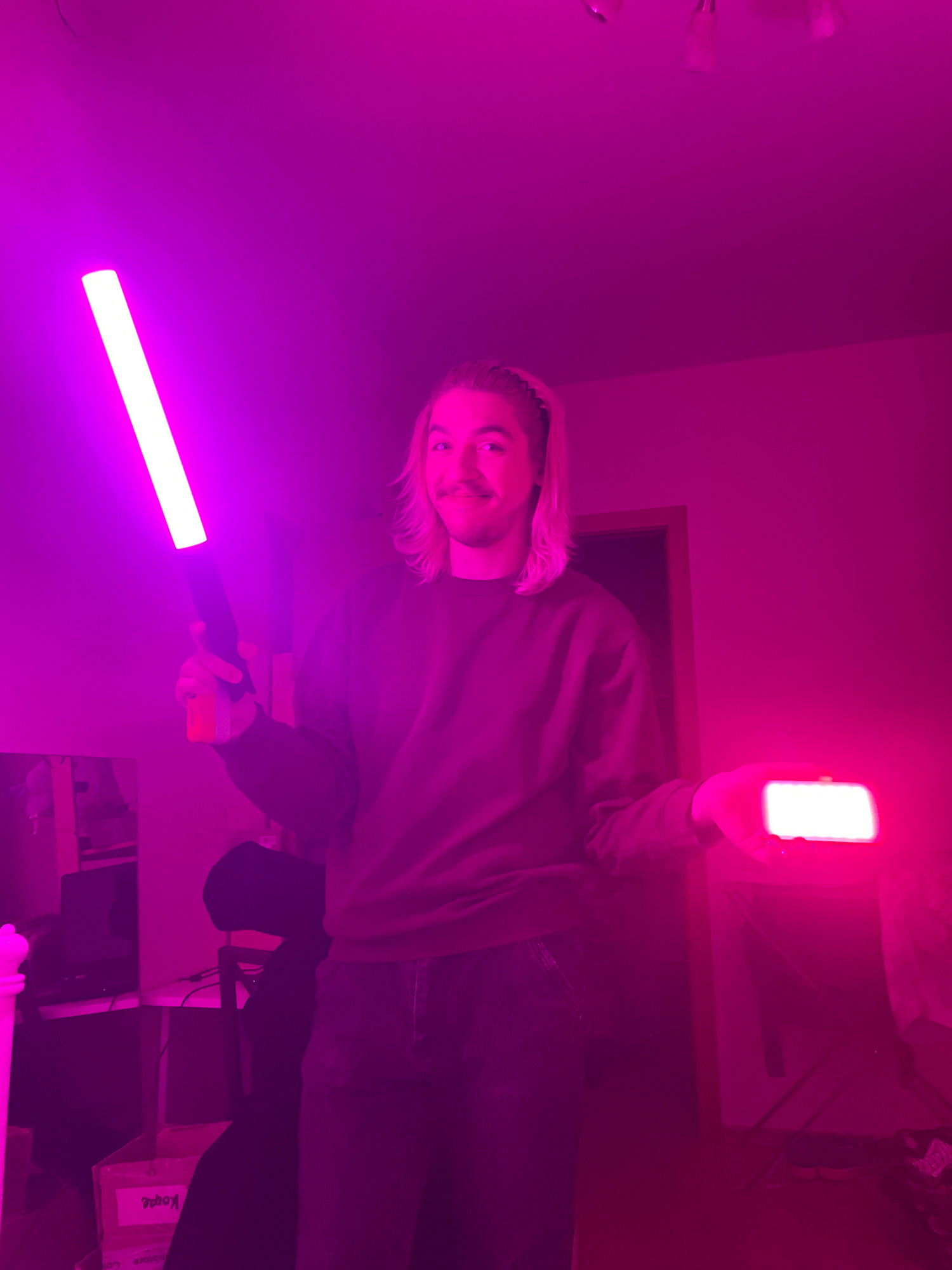 A person with long blond hair, wearing a dark sweatshirt and jeans, stands in a room illuminated by purple light. They hold a light-up tube in their left hand and a bright white phone or similar devic…read more