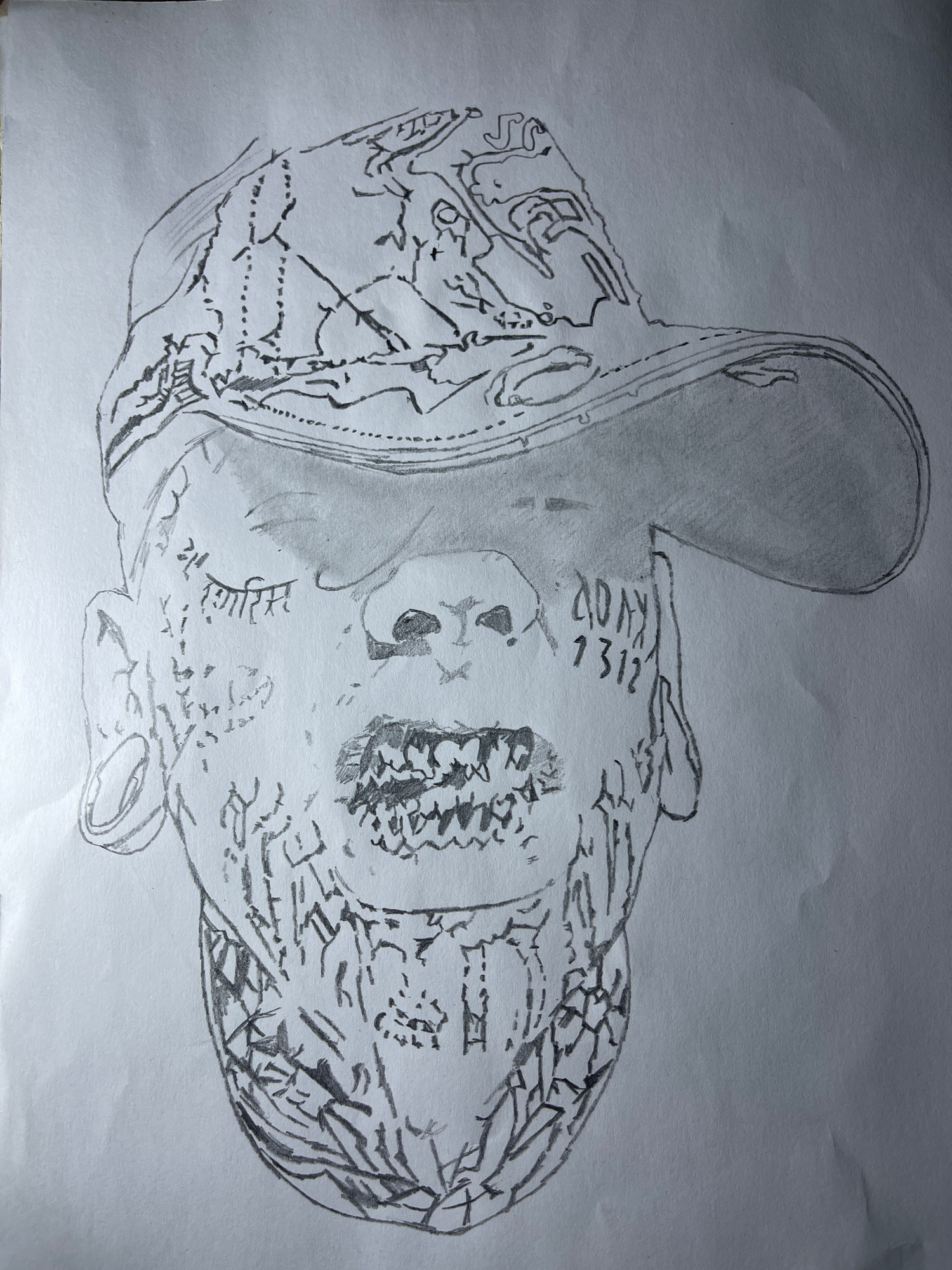 A grayscale pencil drawing on white paper depicts a face with intricate designs and details. The face has a skull-like appearance around the eye and nose areas. There are symbols and markings around t…read more