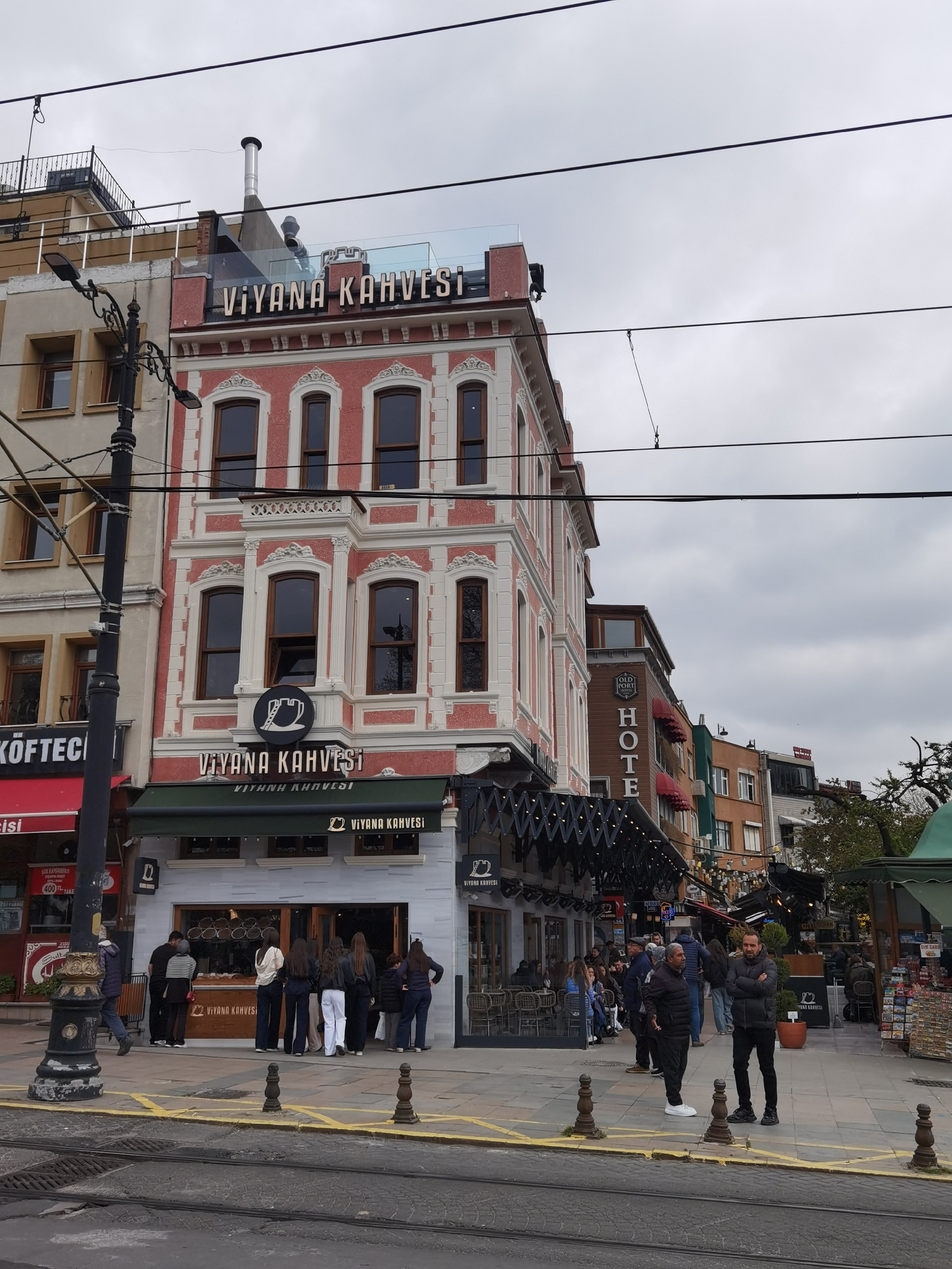 This media file captures a street scene in Istanbul, Turkey, on an overcast day. The focal point is a multi-story building with distinctive red and white decorative facade, housing a cafe named "Viyan…read more
