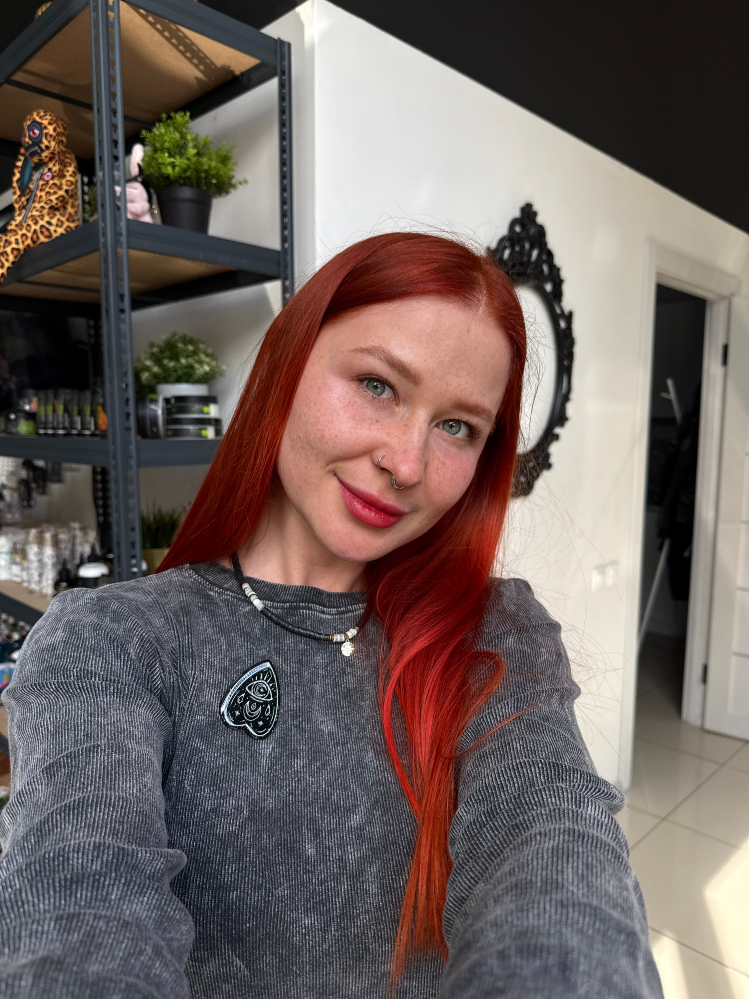 A selfie of a fair-skinned woman with bright red hair and freckles, wearing a gray corduroy shirt with a decorative pin, is the focal point of the image. The background is a room with white walls and…read more