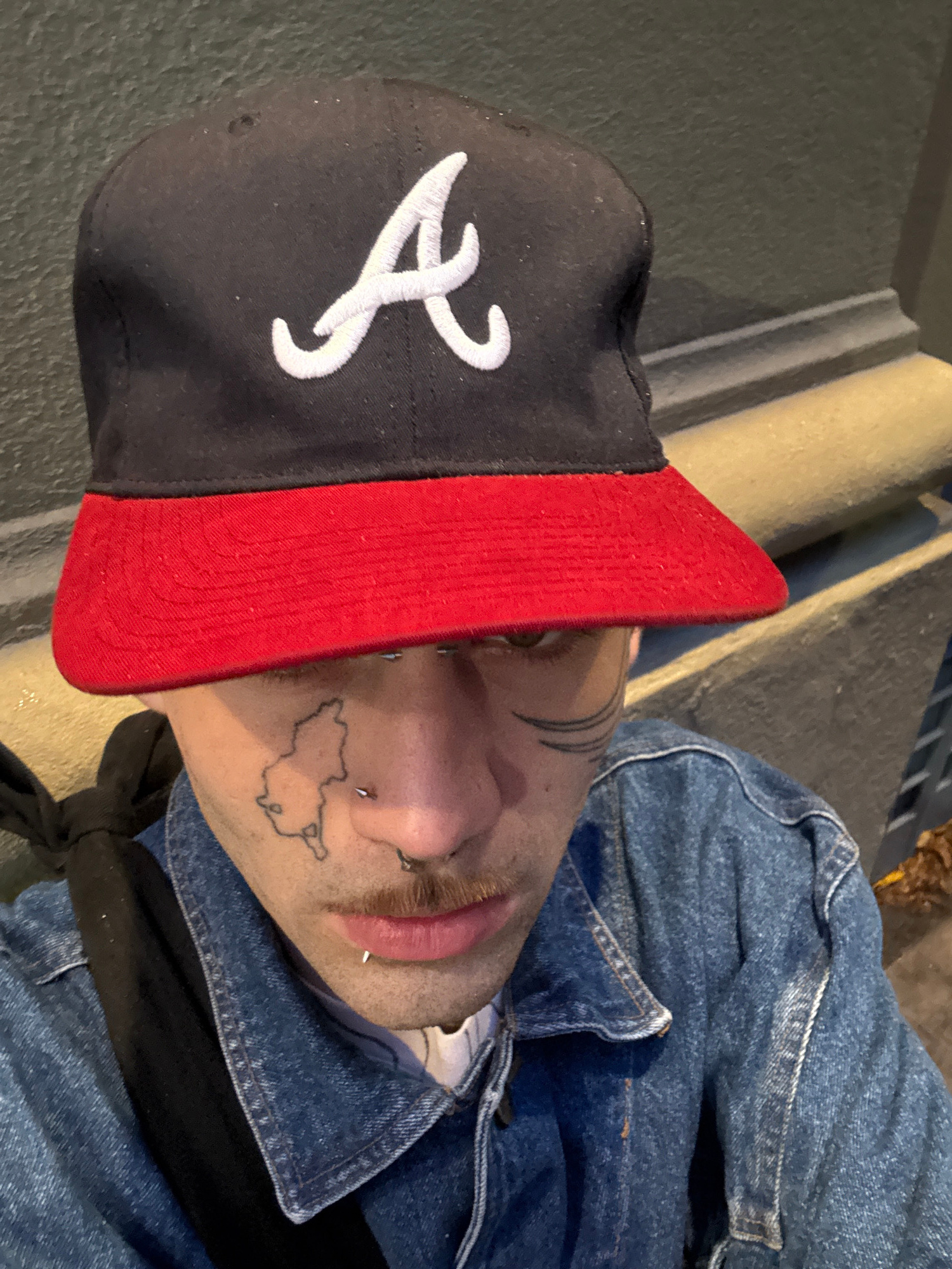 A person wearing a black baseball cap with a white "A" logo and a red bill, a denim jacket, and a black shirt, is looking at the camera. The person has multiple facial piercings and tattoos. The backg…read more