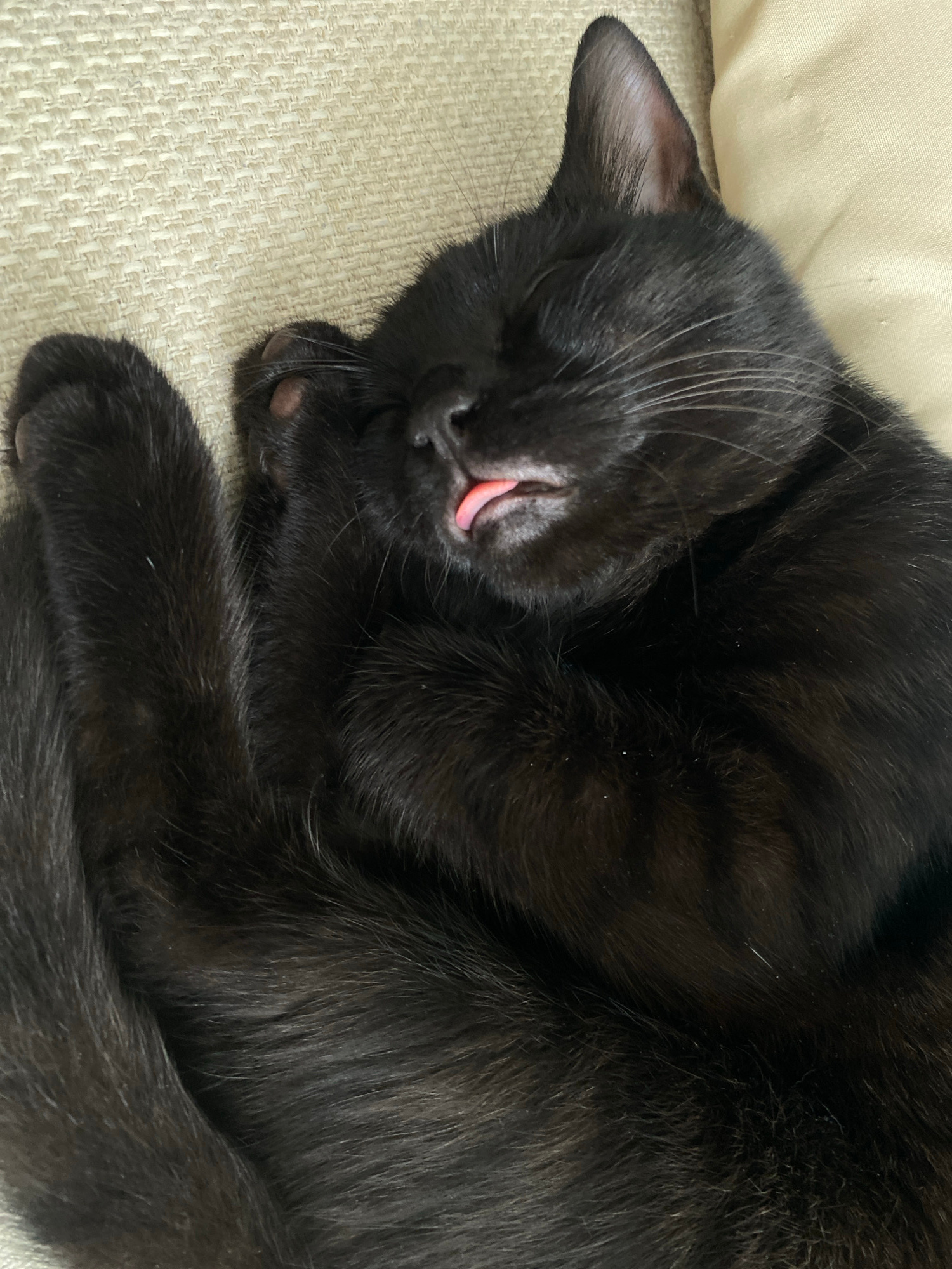 A close-up image shows a black cat deeply asleep, curled up on a light-colored, textured fabric surface, likely a sofa or bed. The cat's eyes are closed, and its head is resting on its paws. A small p…read more