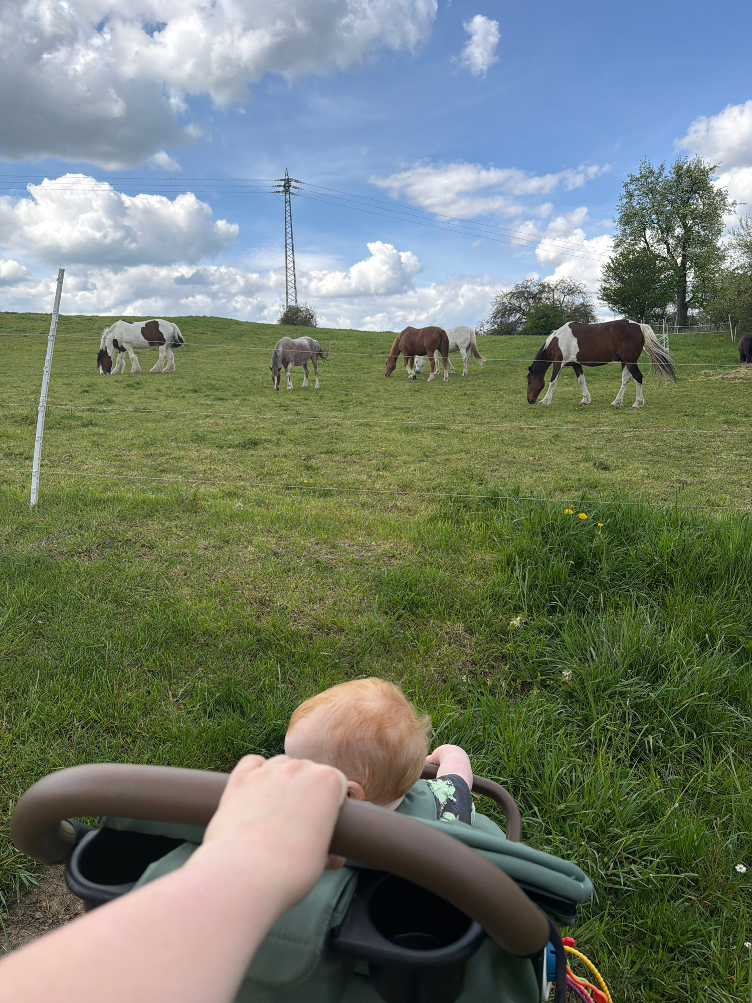 An outdoor scene captures a baby and an adult observing horses in a grassy field on a clear, sunny day in Gangloff, Germany. In the immediate foreground, an adult's fair-skinned hand is seen holding…read more