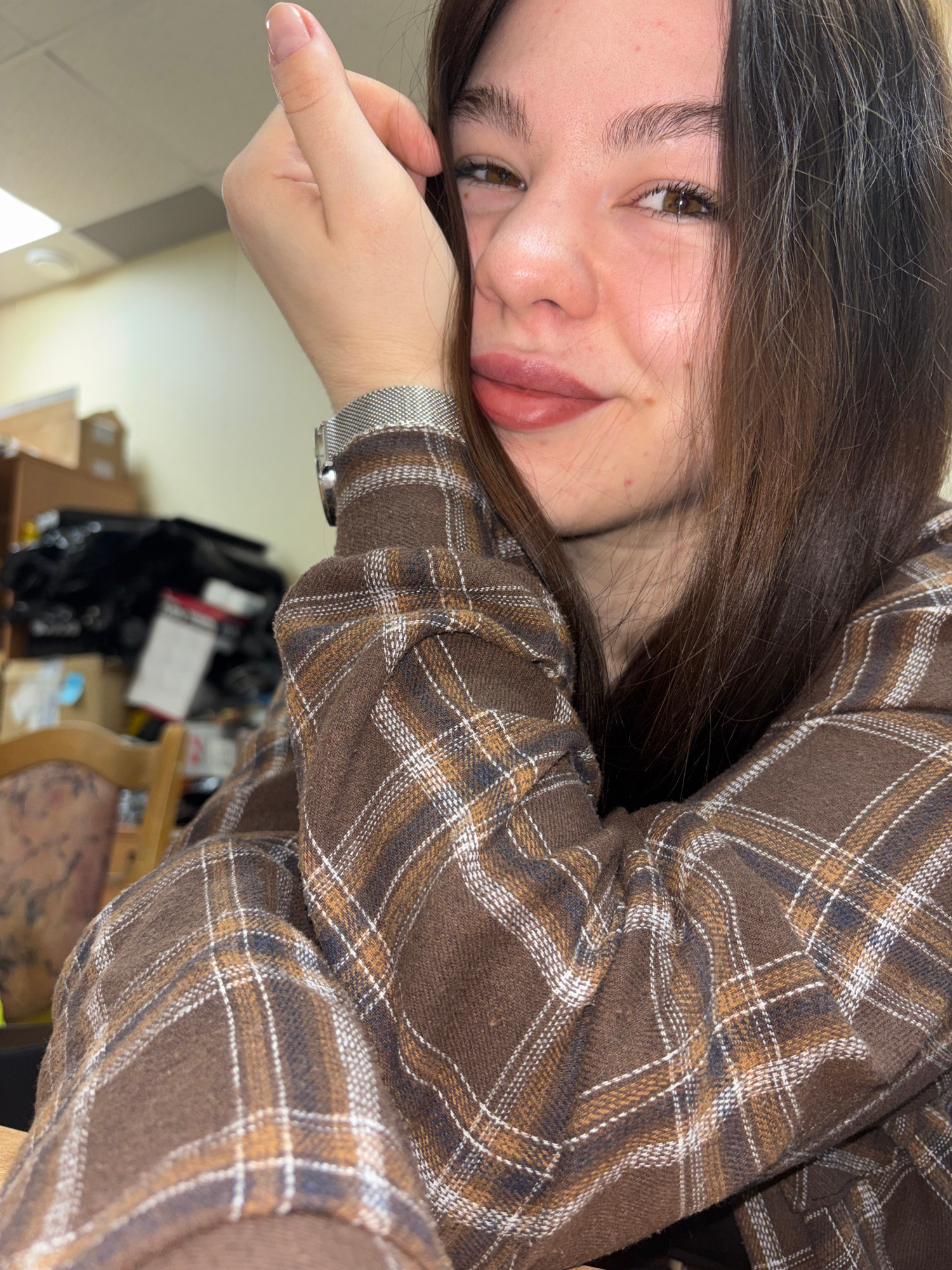 A woman with long brown hair, fair skin, and light brown eyes is resting her head on her hand. She is wearing a brown and tan plaid flannel shirt and a silver wristwatch. The background is blurry and…read more