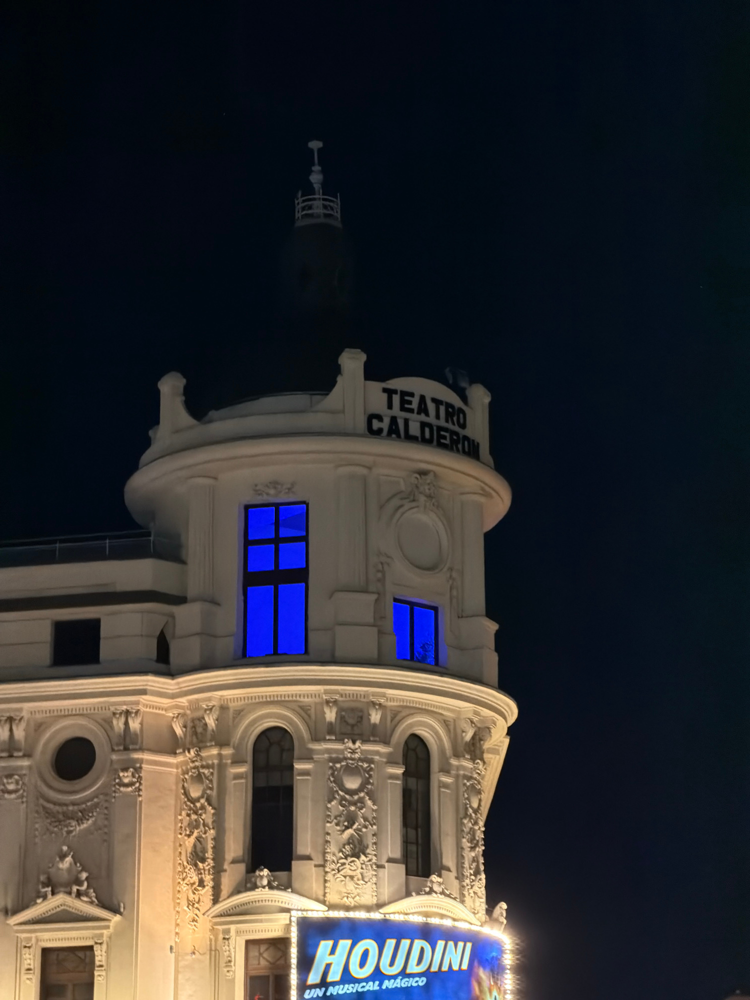 The image shows the Teatro Calderón in Madrid, Spain, at night. The building is illuminated, and a sign for the show "Houdini" is visible. The building's architecture is ornate, with decorative elemen…read more