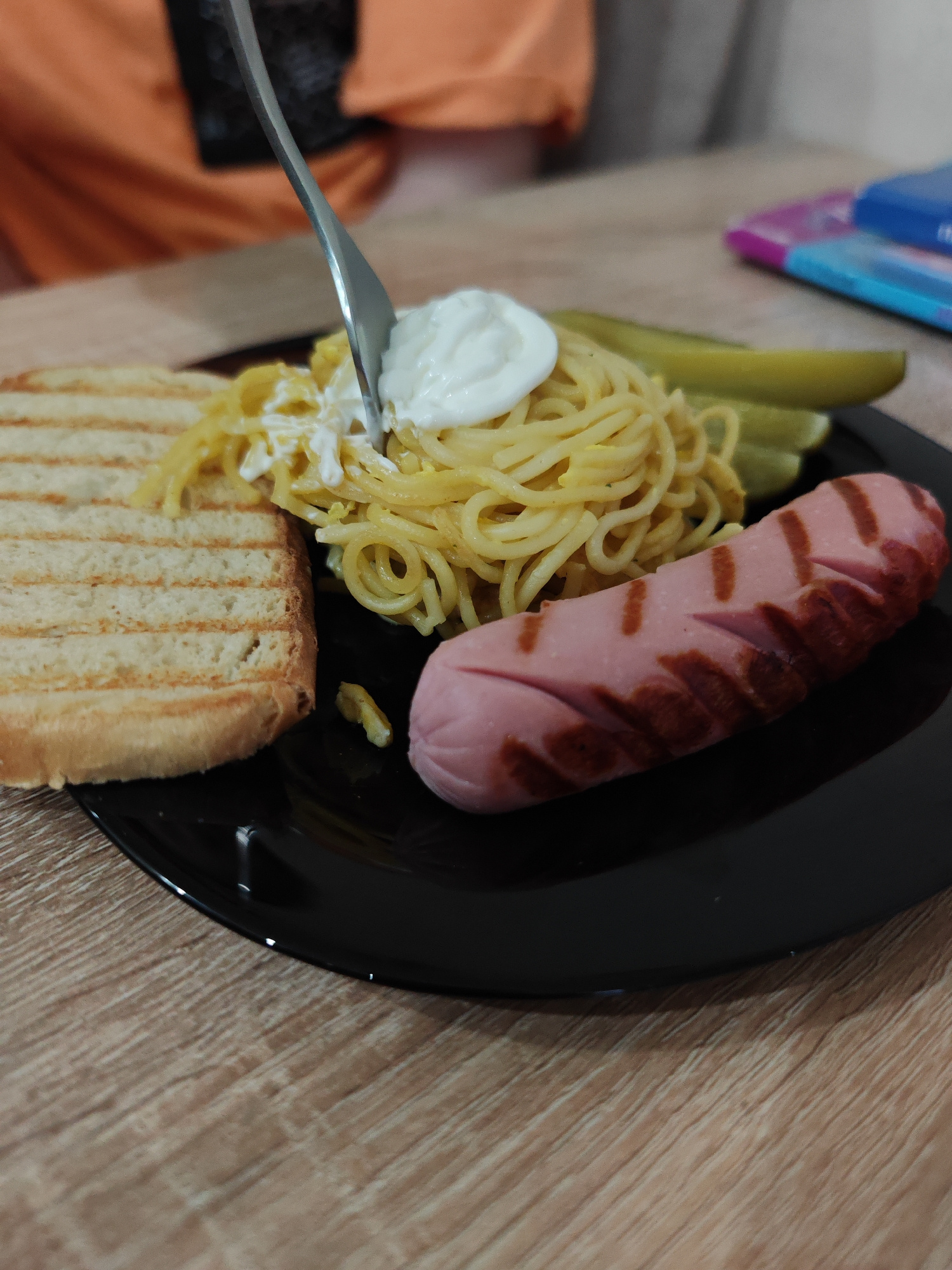 The image shows a close-up of a meal served on a wooden table in Hrodna, Belarus. On a black plate, a portion of spaghetti, possibly mixed with scrambled eggs, is visible. A dollop of a white creamy s…read more