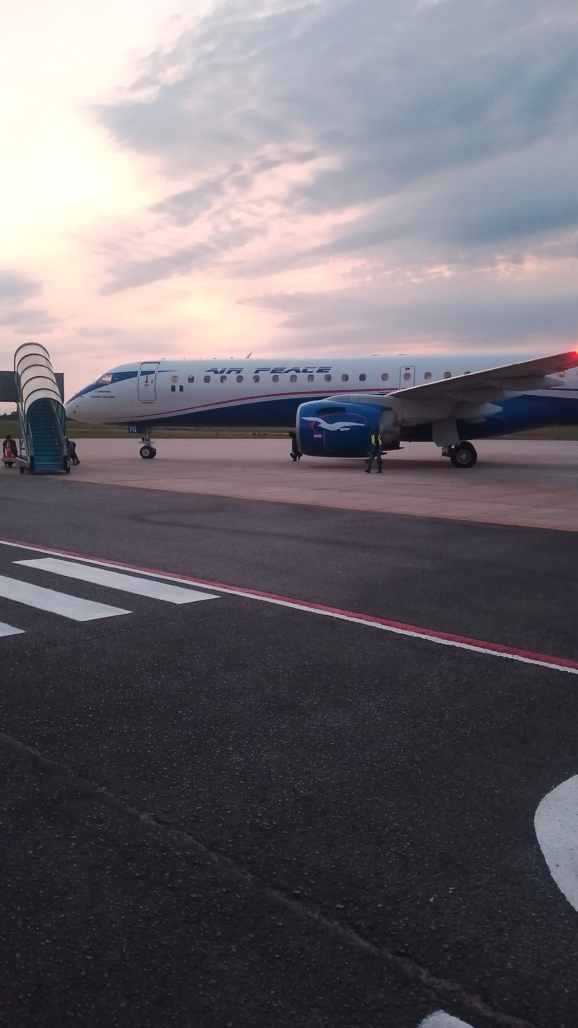 An "Air Peace" passenger jet sits on an airport tarmac in Orerokpe, Nigeria. The plane is white with a blue stripe. A stairway is attached to the front of the plane. Ground personnel are present. The…read more