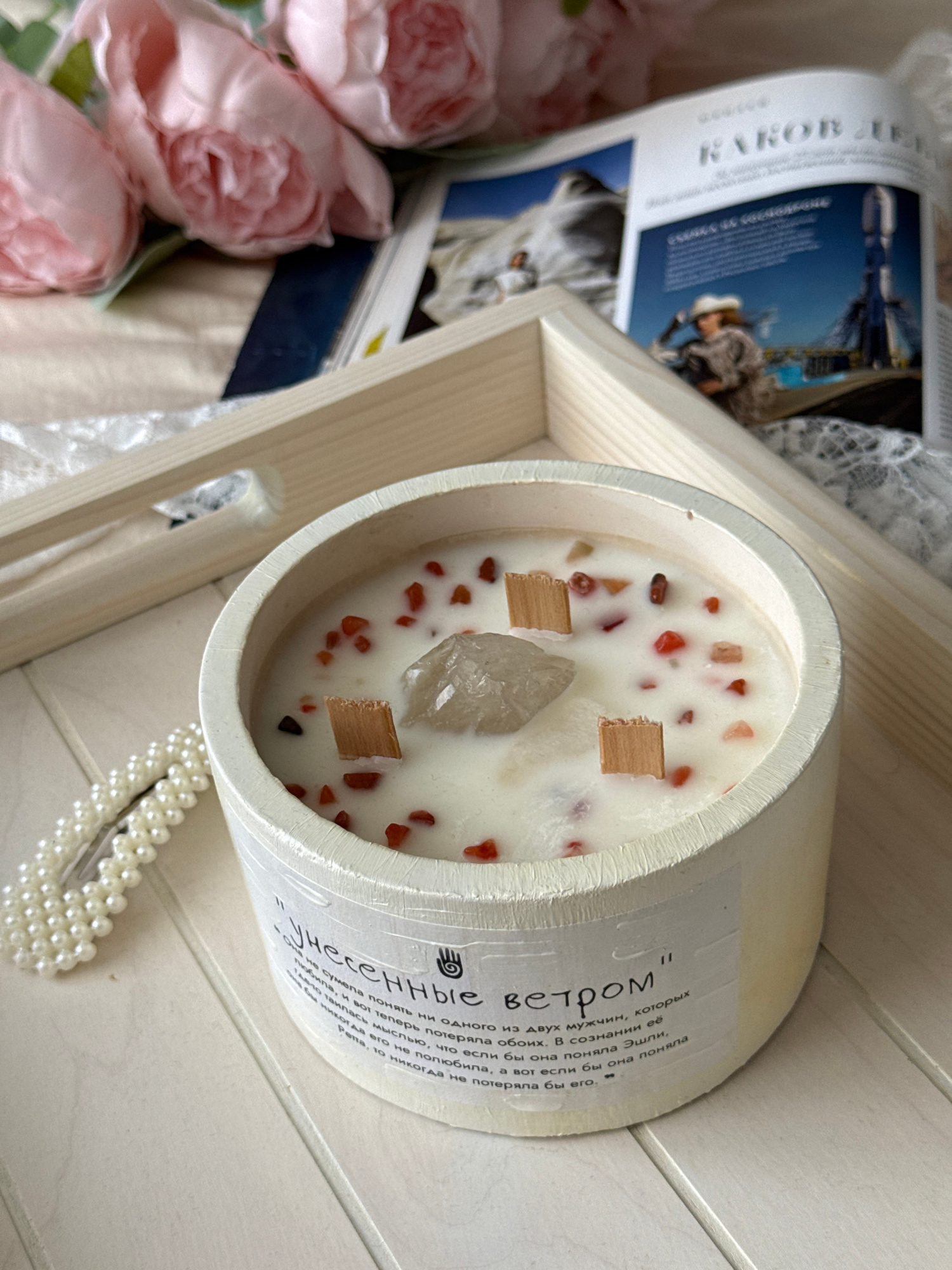 This media file presents a well-arranged still life, captured from an overhead perspective, showcasing a decorative candle as its central subject. The scene suggests a cozy, indoor setting, possibly w…read more