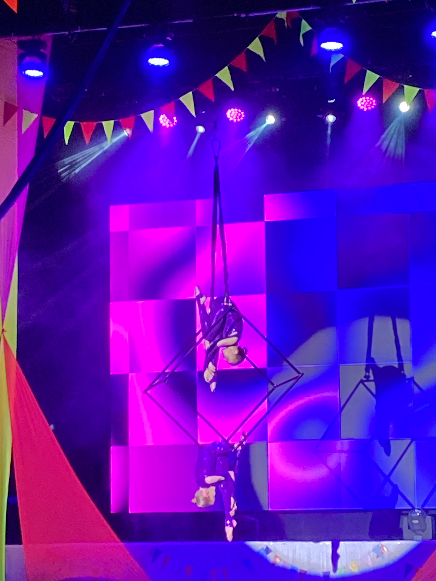 An aerial performance is captured indoors, featuring two individuals engaged in acrobatics. The image is rotated 90 degrees clockwise, making the performers appear to float horizontally across the fraβ¦read more