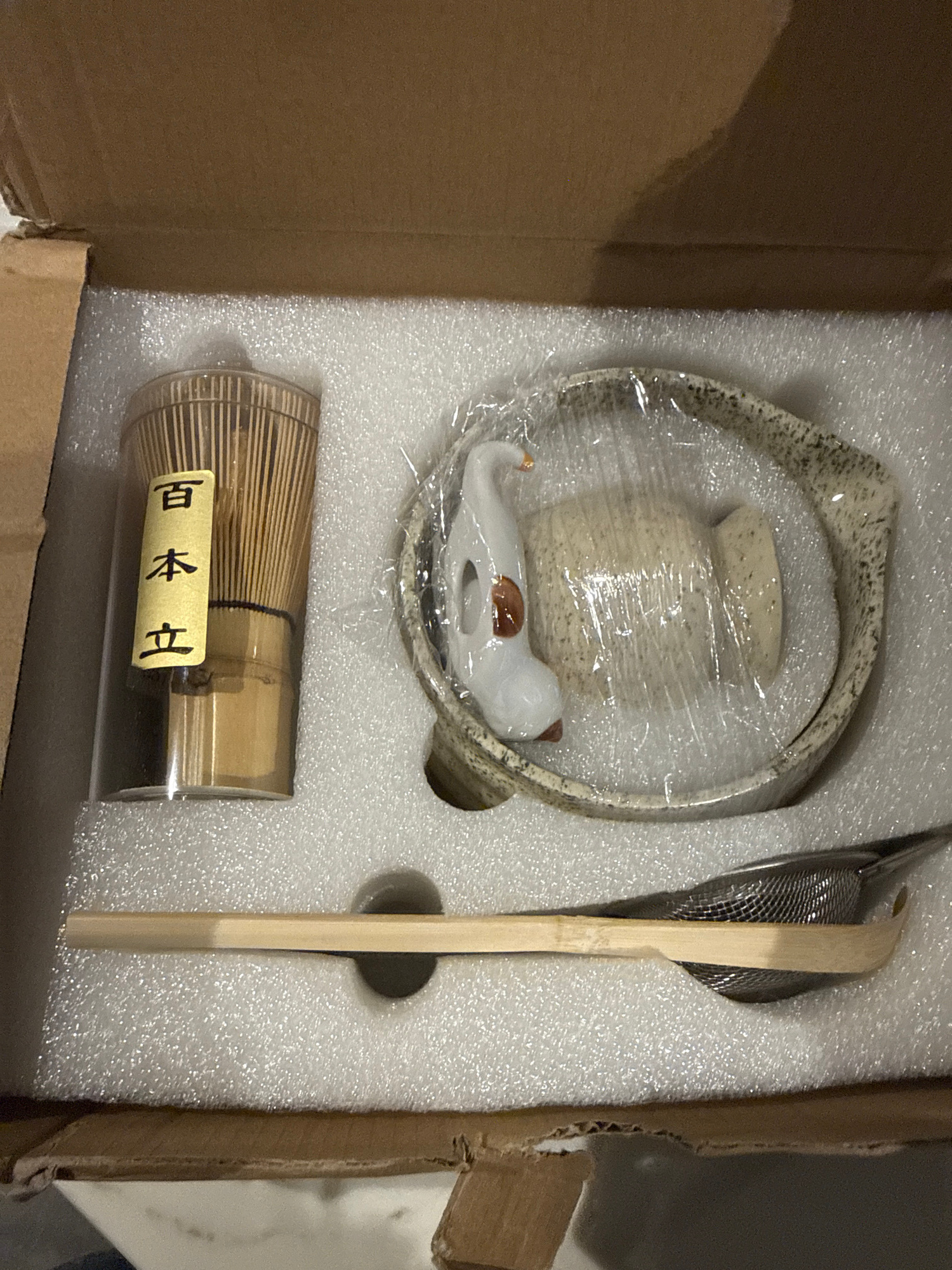 The image shows a set of Japanese tea ceremony equipment in a cardboard box filled with protective foam. The set includes a chawan (tea bowl) with a built-in spout and a small cat figurine, a chashaku…read more