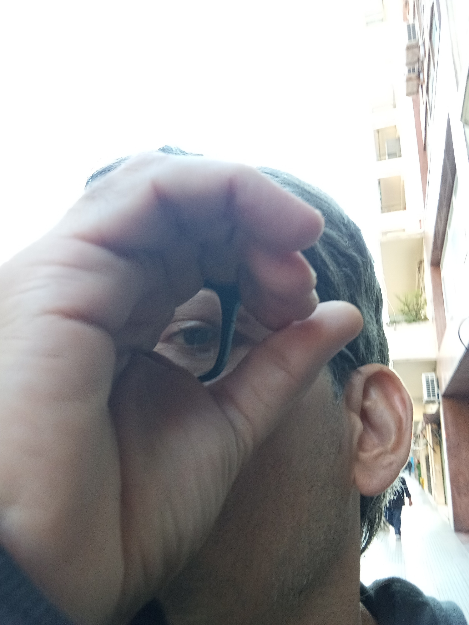 A close-up shot taken from a low angle depicts a person obscuring their face with their hand, which also holds a pair of eyeglasses. The person has short, dark gray hair and light skin. Part of an ear…read more