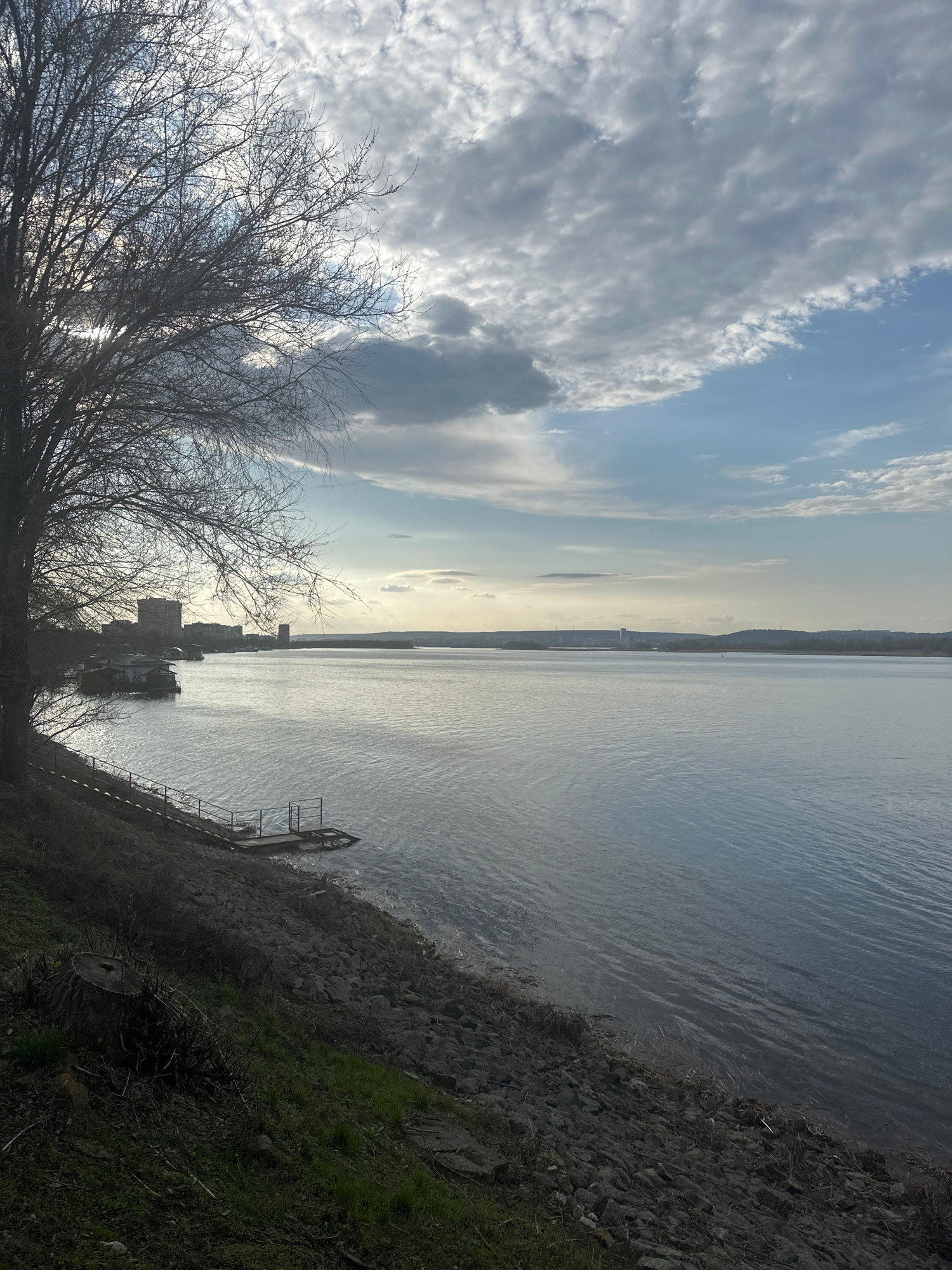 The image depicts a waterfront scene in Engels, Russia. A body of water, likely the Volga River, dominates the right side of the frame, stretching towards the horizon. Its surface shows subtle wave patterns, reflecting the sky. The right bank is a mixture of rocks and vegetation, with a metal staircase leading down to the water. Buildings are visible on the opposite bank in the distance. The left side of the image includes a bare tree in the foreground, its branches silhouetted against a cloudy sky. The sky features a mix of white and grey clouds, suggesting a partly cloudy day. The overall lighting indicates it is daytime. | Open Wire