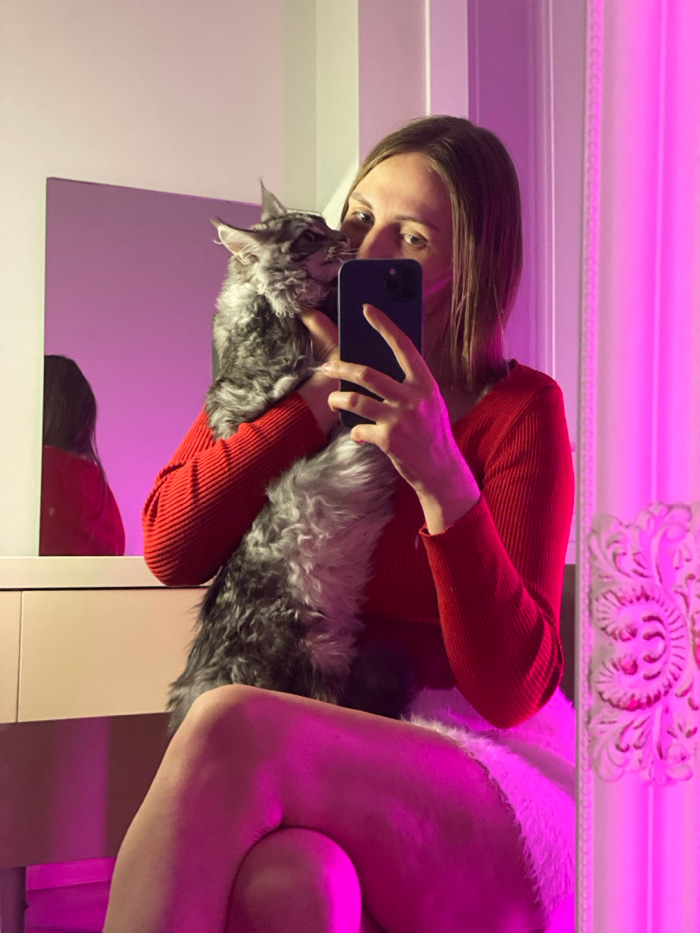 A woman in a red sweater and white shorts takes a selfie in a mirror. She holds a large gray Maine Coon cat close to her face, seemingly kissing it. The image is bathed in pink light, illuminating a d…read more