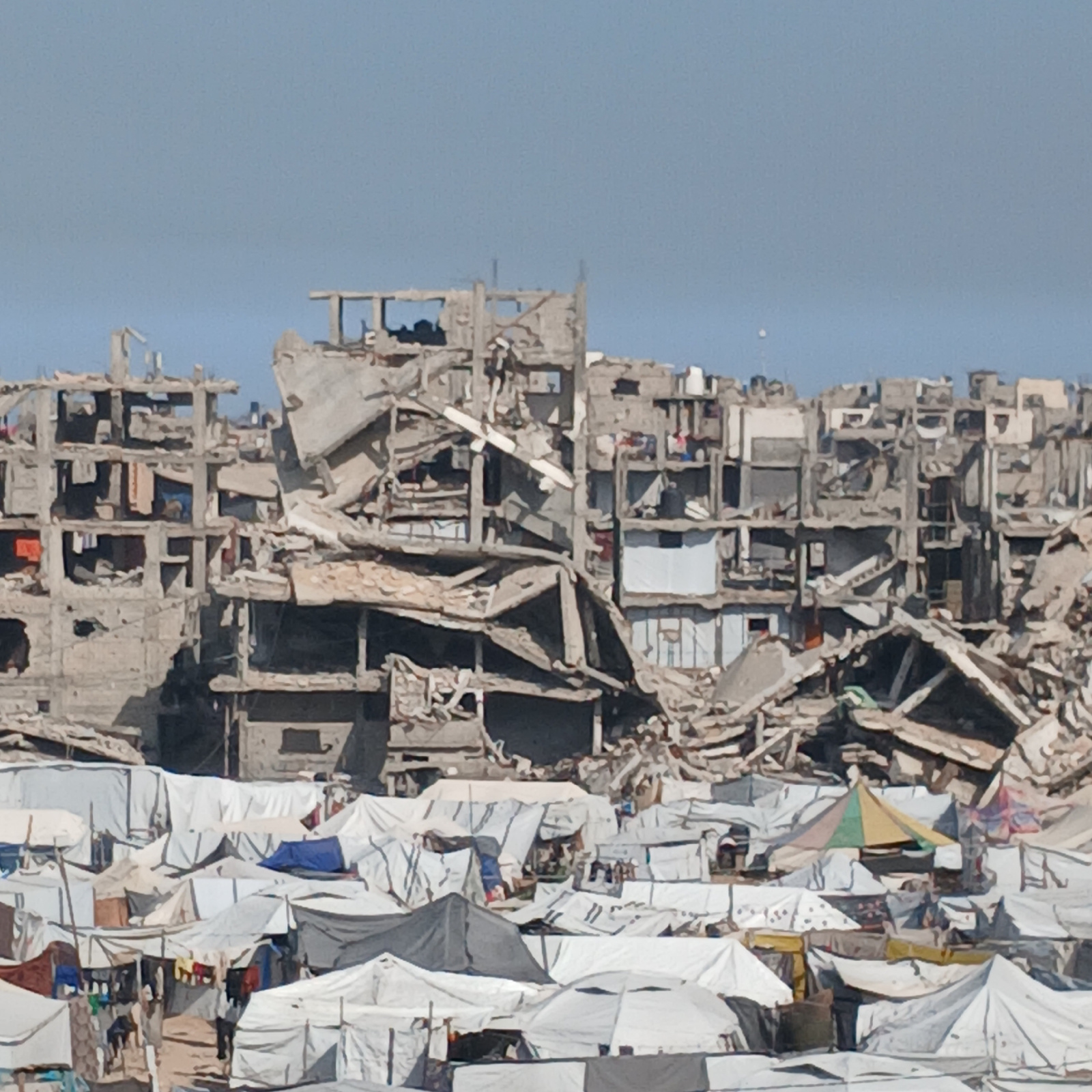 The image depicts a scene of devastation in what appears to be the aftermath of conflict or natural disaster. Severely damaged or completely destroyed buildings, primarily constructed of concrete, are…read more