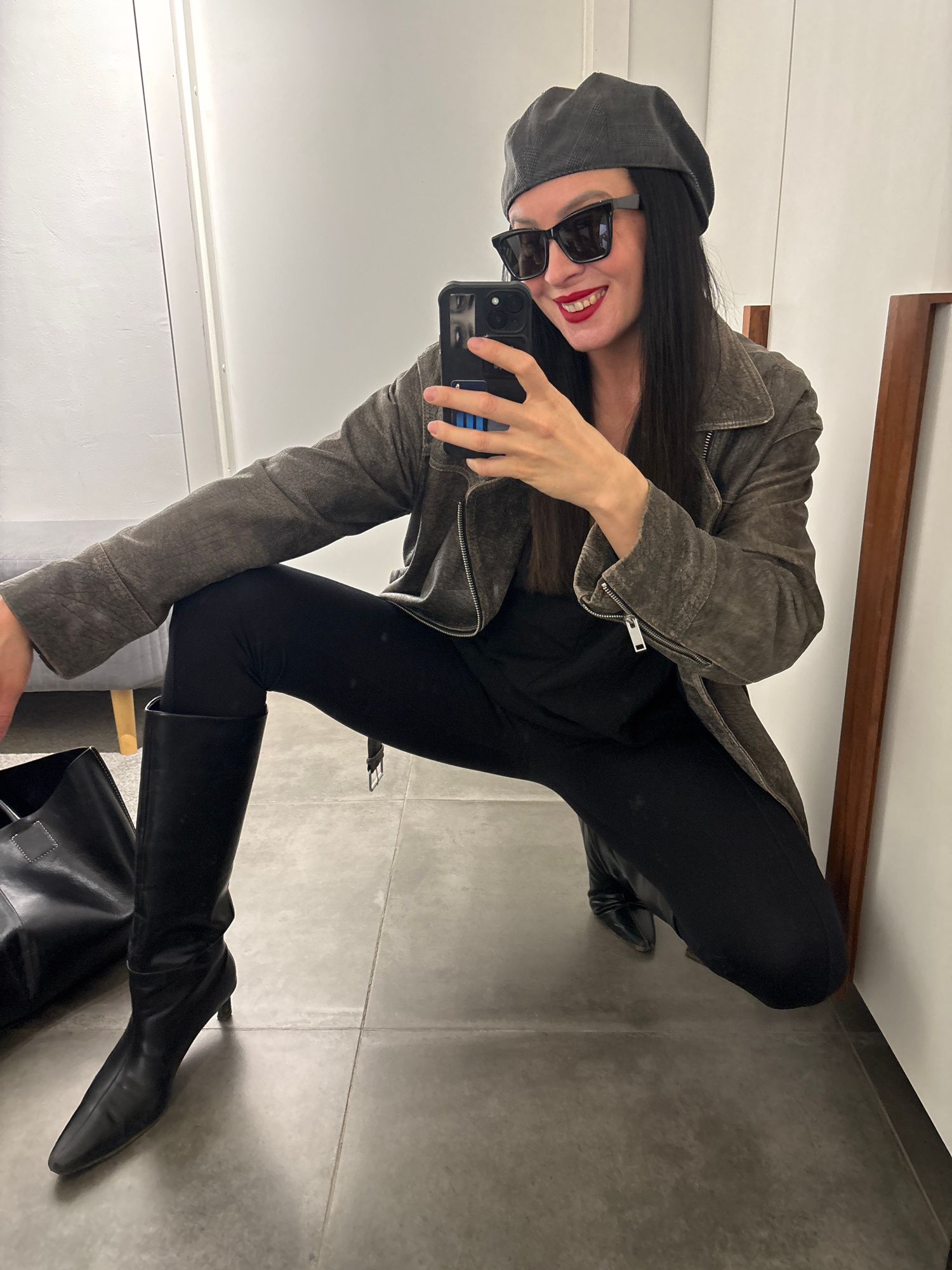 The image shows a woman taking a selfie in what appears to be a fitting room. She is crouching, facing the mirror, holding her phone up to capture the image. She is wearing a grey cap, sunglasses, a g…read more