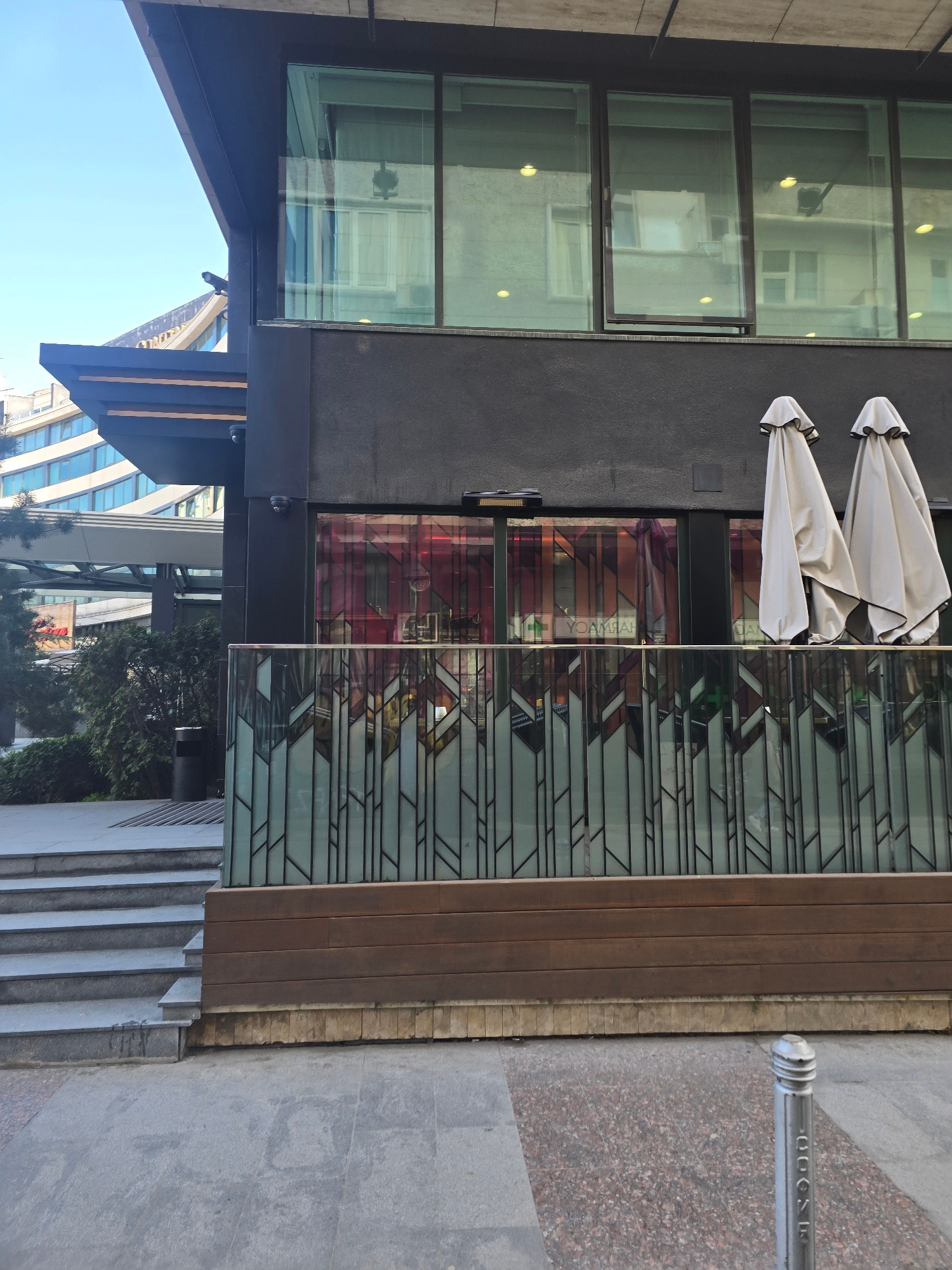 An outdoor scene in an urban setting, featuring a modern building facade with ground-level pavement. The building has a dark, likely black or dark grey, exterior. Its upper section features large, rec…read more