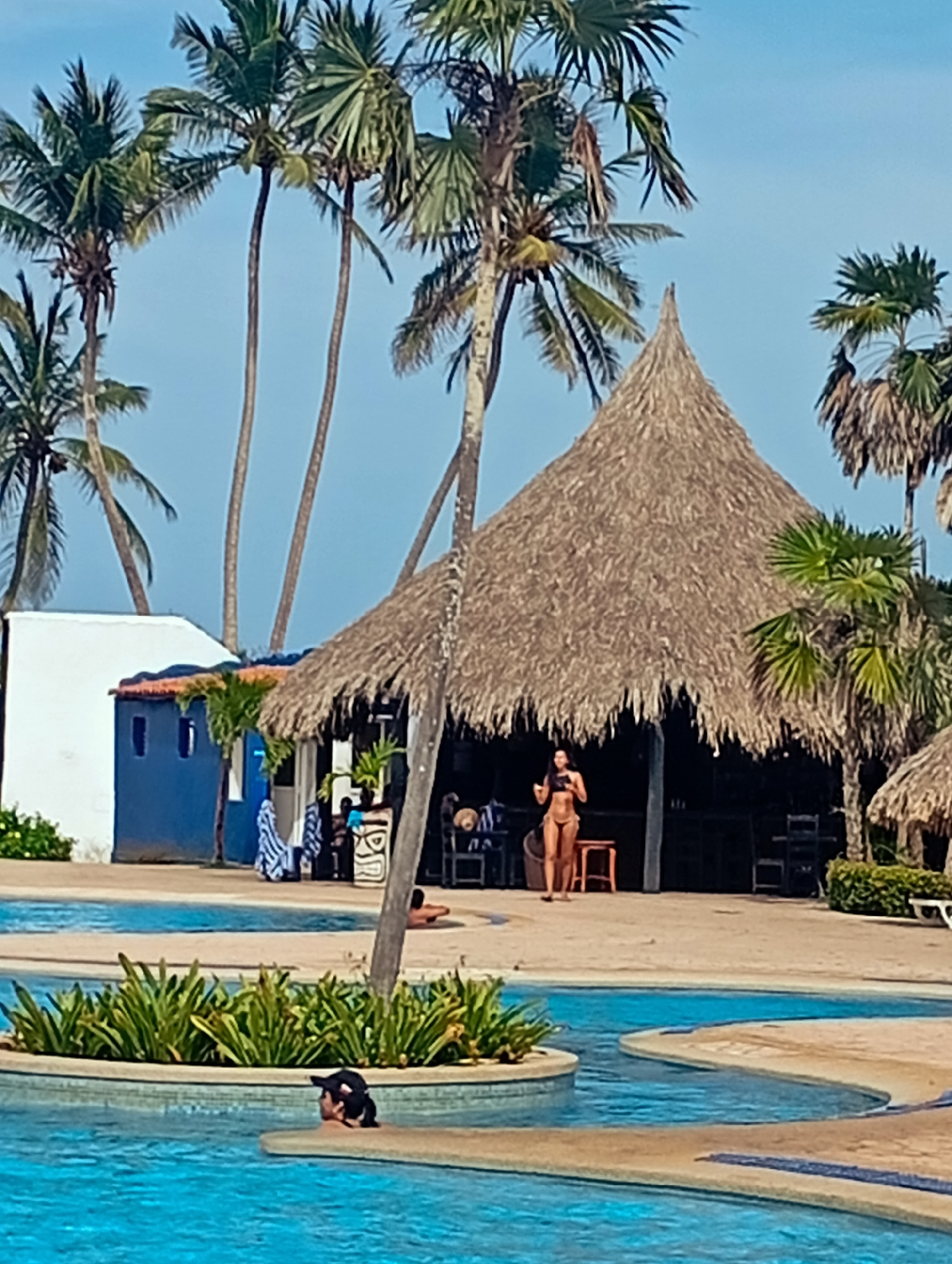 The image shows a scene at Playa El Agua, Venezuela. In the foreground is a turquoise swimming pool with a small, landscaped island in the center. A person's head, wearing a black cap, is visible abov…read more