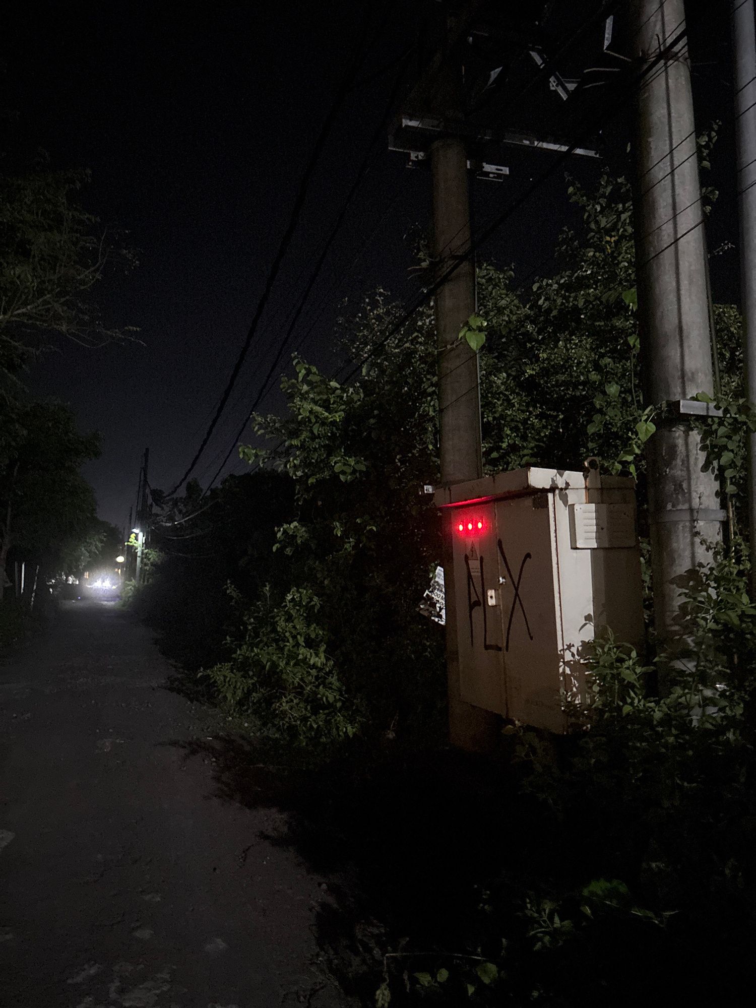 The image, taken at night in Ungasan, Indonesia, shows a utility pole with overgrown vegetation. A white electrical box is attached to the pole. The box has a black "X" painted on it, as well as other…read more