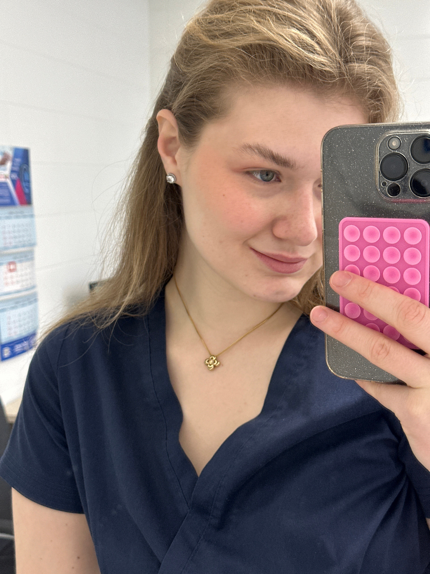 A person is taking a selfie indoors. The person has light blonde hair and fair skin, wearing a navy blue shirt. A gold necklace with a four-leaf clover pendant is visible. The phone in use has a gray…read more