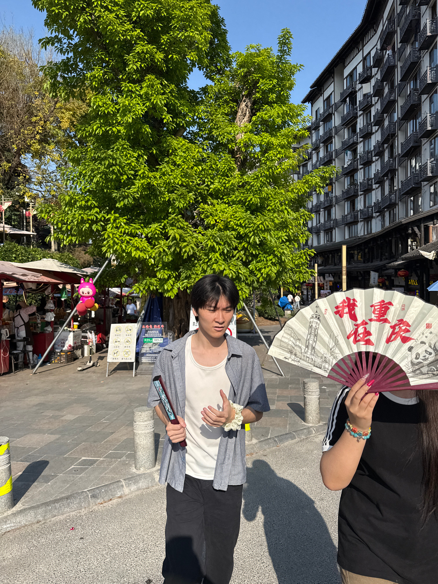 A young man stands on a paved street in Shapingba District, China, holding a closed fan. A woman behind him holds an open fan with Chinese characters and a panda illustration. A large tree with green…read more