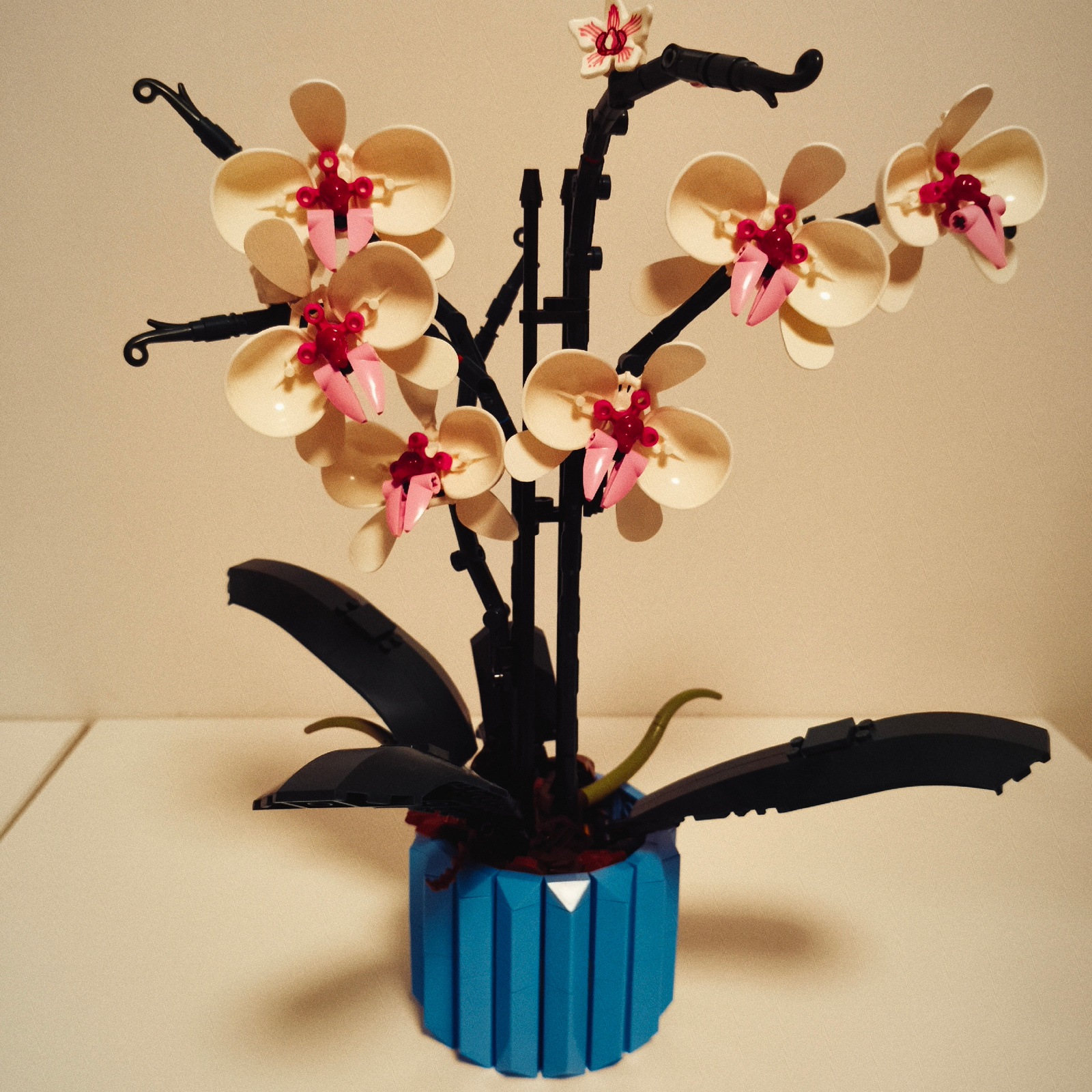 A close-up shot features a Lego Orchid plant set in a bright blue pot on a white surface, with a beige wall in the background. The plant has multiple cream-colored flowers with pink and red accents. T…read more