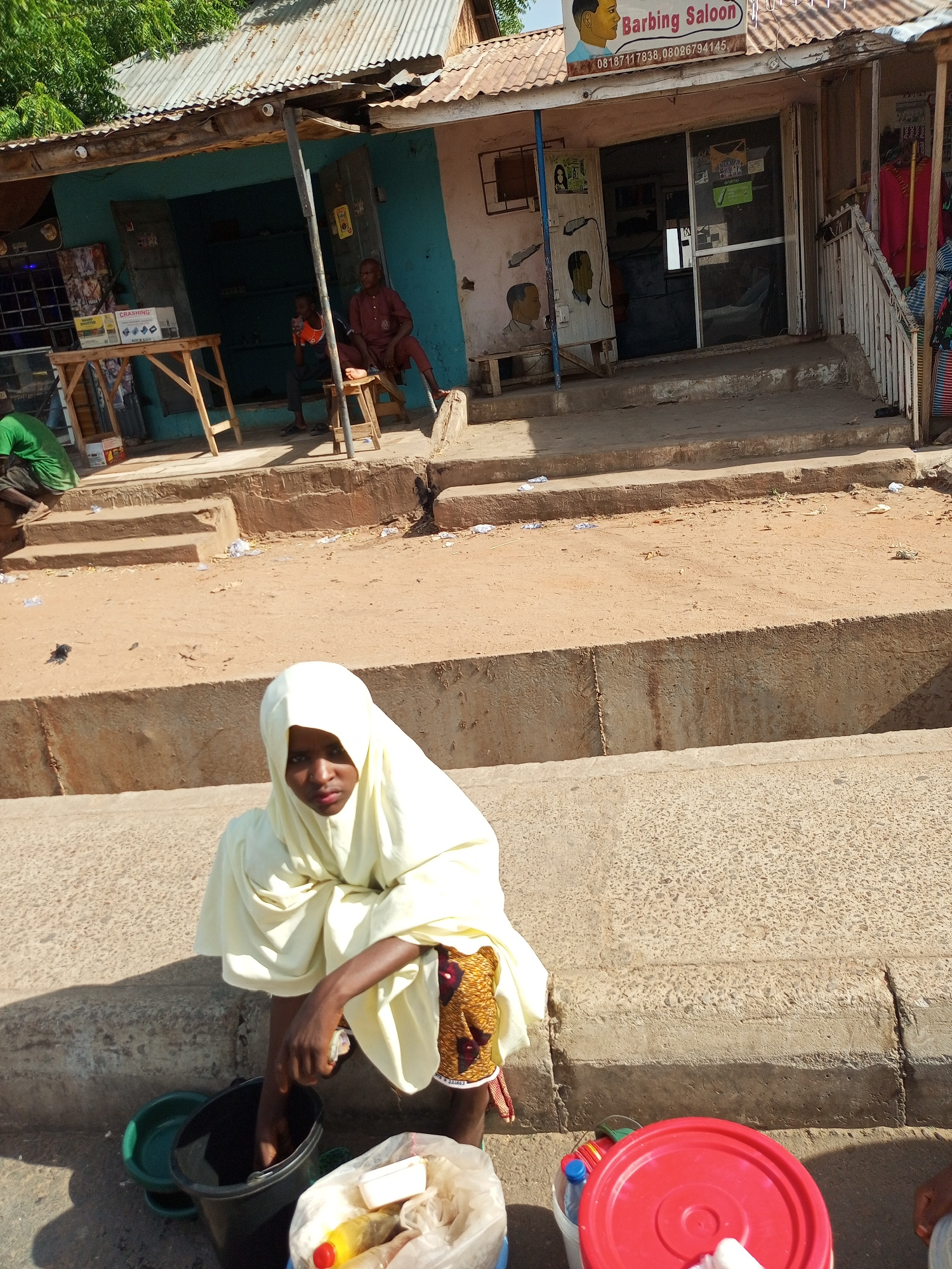 A woman in a white hijab sits on a concrete ledge on a sunny day, near what appears to be a street in Timia, Niger. She is crouched down next to a black bucket, a green dish, a clear plastic bag conta…read more