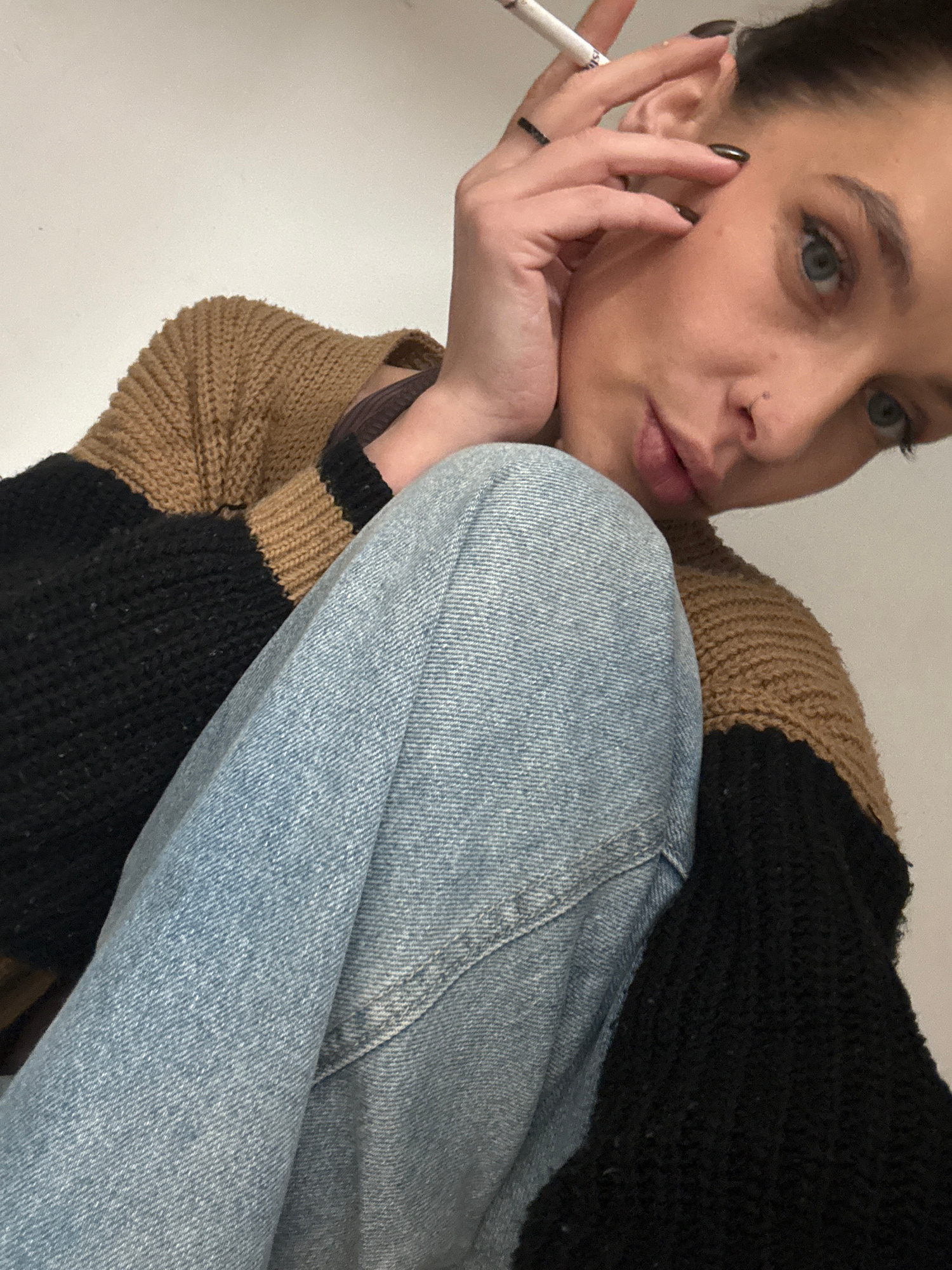 A young woman with light skin and blue eyes poses in a close-up shot. She rests her chin on her hand, holding a cigarette. She wears a black and tan sweater and denim pants. The background is a plain…read more