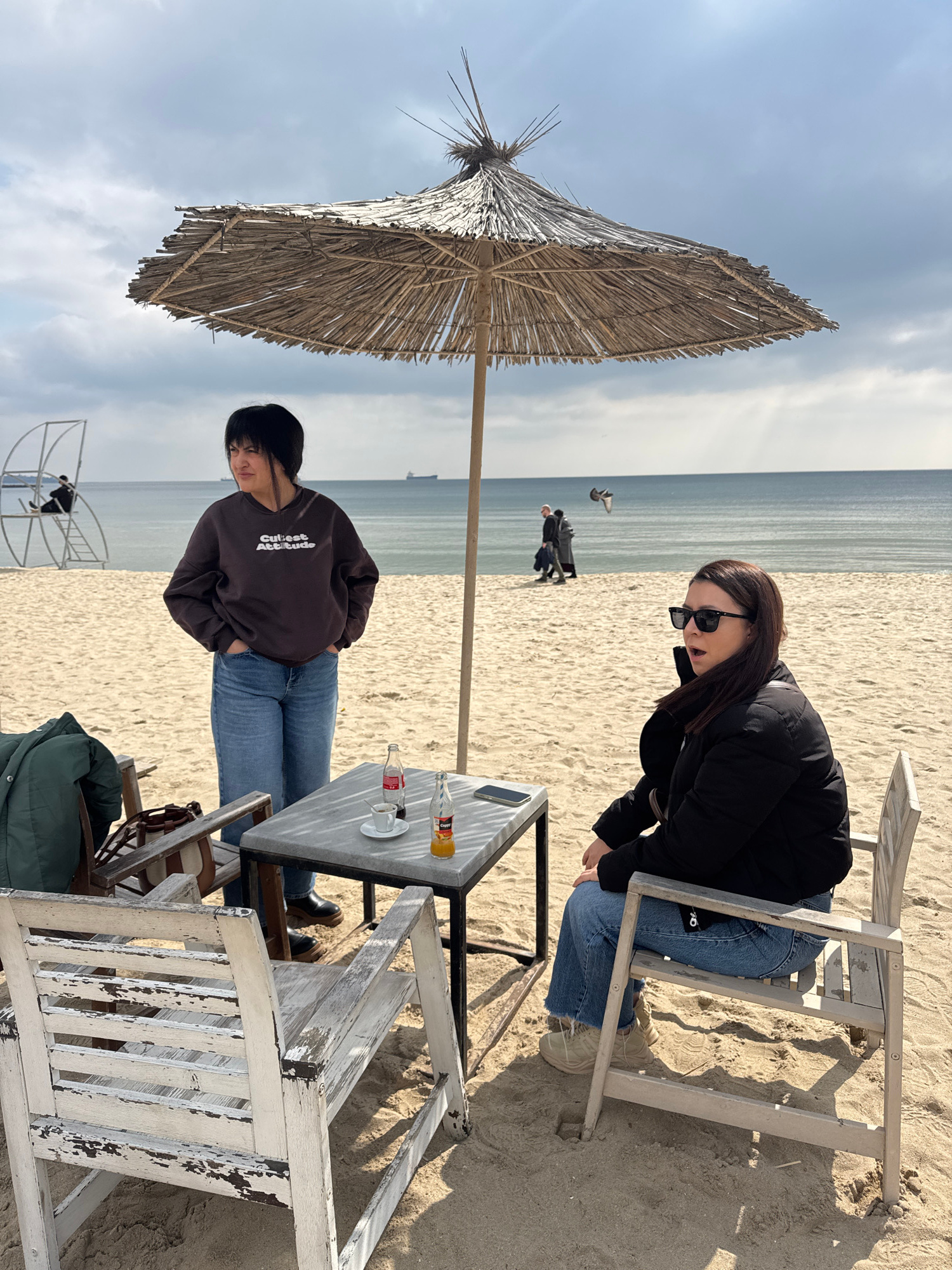 Two women are seated at a white, weathered table on a sandy beach. One woman, wearing a brown sweatshirt with the words "Cutest Attitude" and blue jeans, has short dark hair and is leaning on the tabl…read more