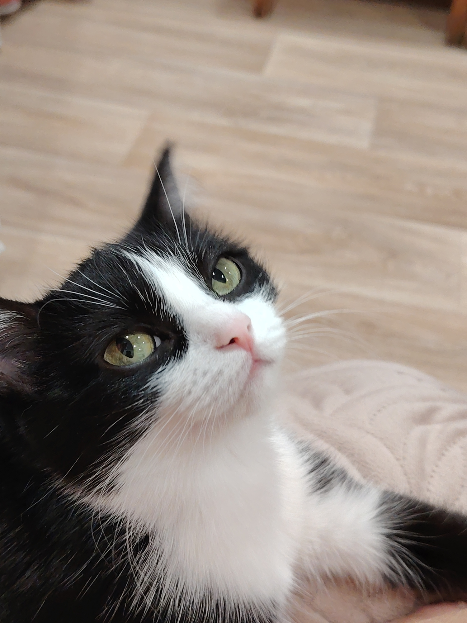 A close-up shot captures a black and white cat with green eyes, gazing upwards. The cat's fur is primarily black, with white markings on its face, chest, and paws. It rests on a light pink surface, po…read more
